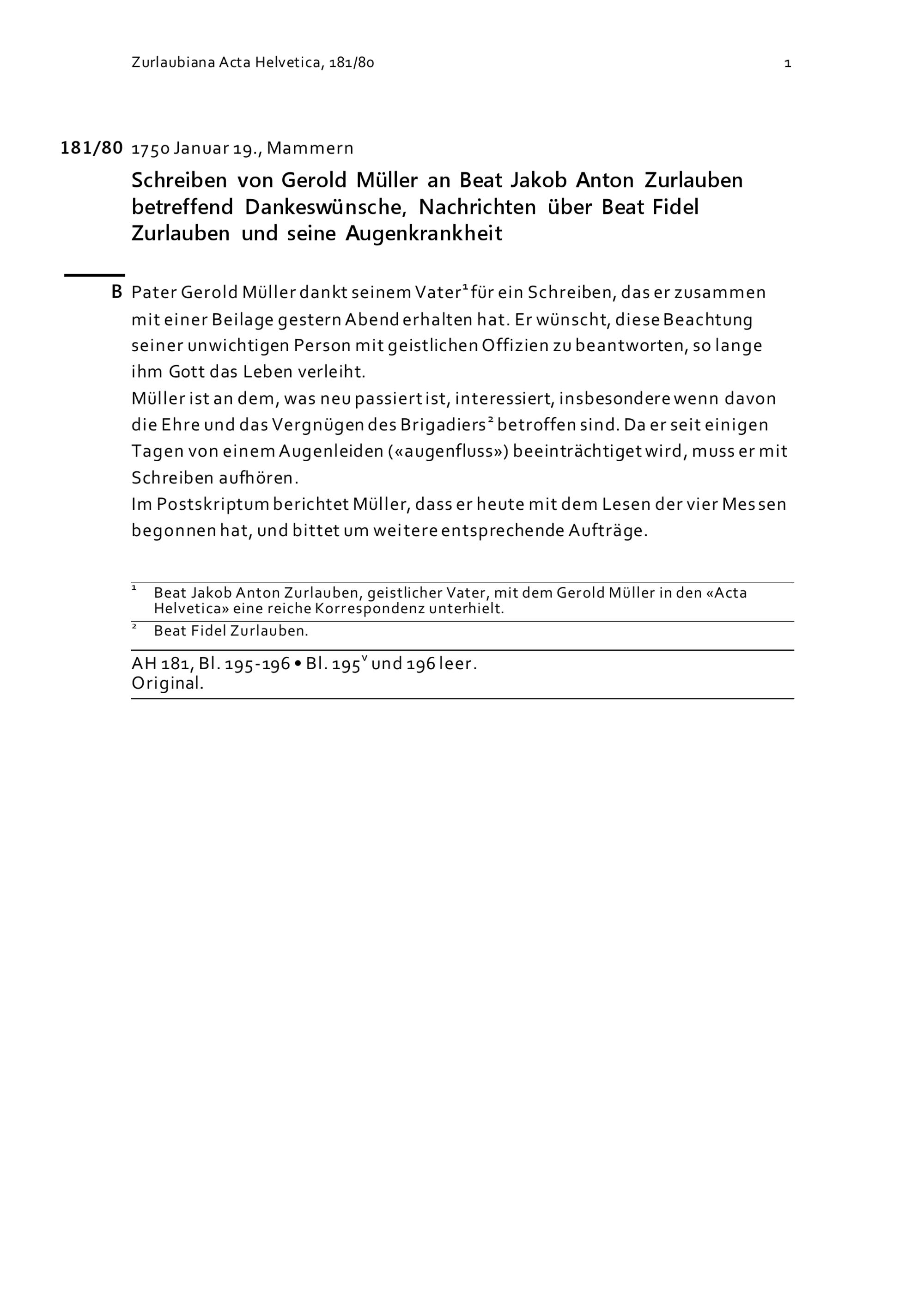 Schreiben von Gerold Müller an Beat Jakob Anton Zurlauben betreffend Dankeswünsche, Nachrichten über Beat Fidel Zurlauben und seine Augenkrankheit
