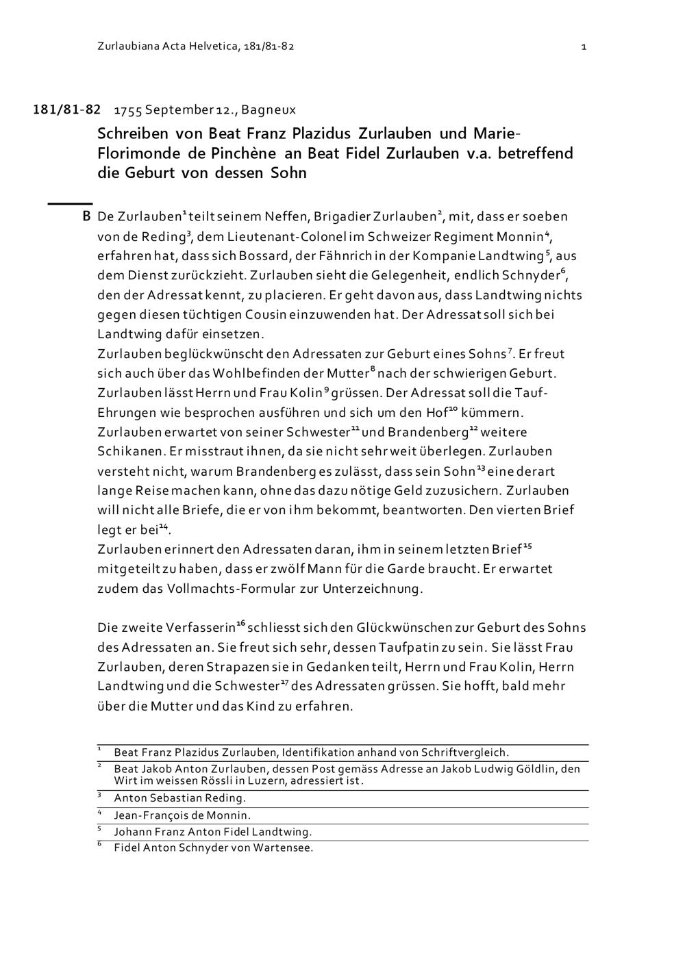 Schreiben von Beat Franz Plazidus Zurlauben und Marie-Florimonde de Pinchène an Beat...