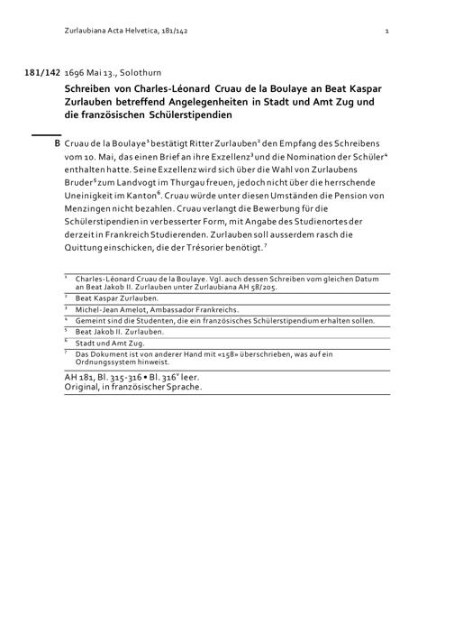Schreiben von Charles-Léonard Cruau de la Boulaye an Beat Kaspar Zurlauben betreffend Angelegenheiten in Stadt und Amt Zug und die französischen Schülerstipendien