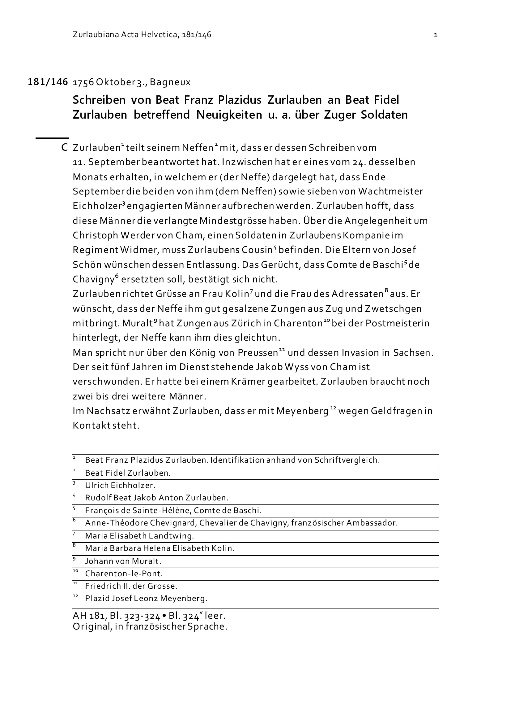 Schreiben von Beat Franz Plazidus Zurlauben an Beat Fidel Zurlauben betreffend Neuigkeiten u. a. über Zuger Soldaten