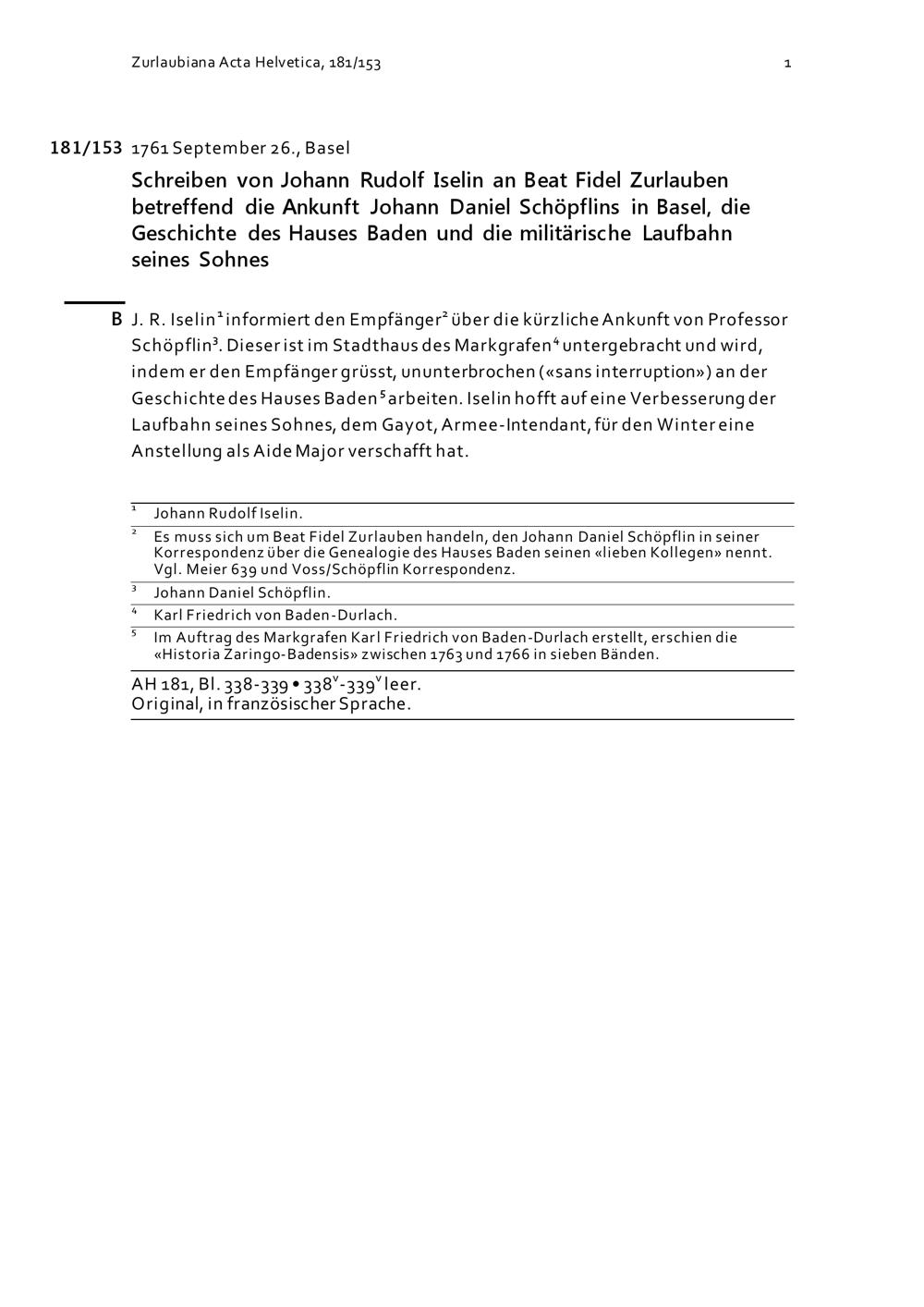 Schreiben von Johann Rudolf Iselin an Beat Fidel Zurlauben betreffend die Ankunft Johann Daniel Schöpflins in Basel, die Geschichte des Hauses Baden und die militärische Laufbahn seines Sohns