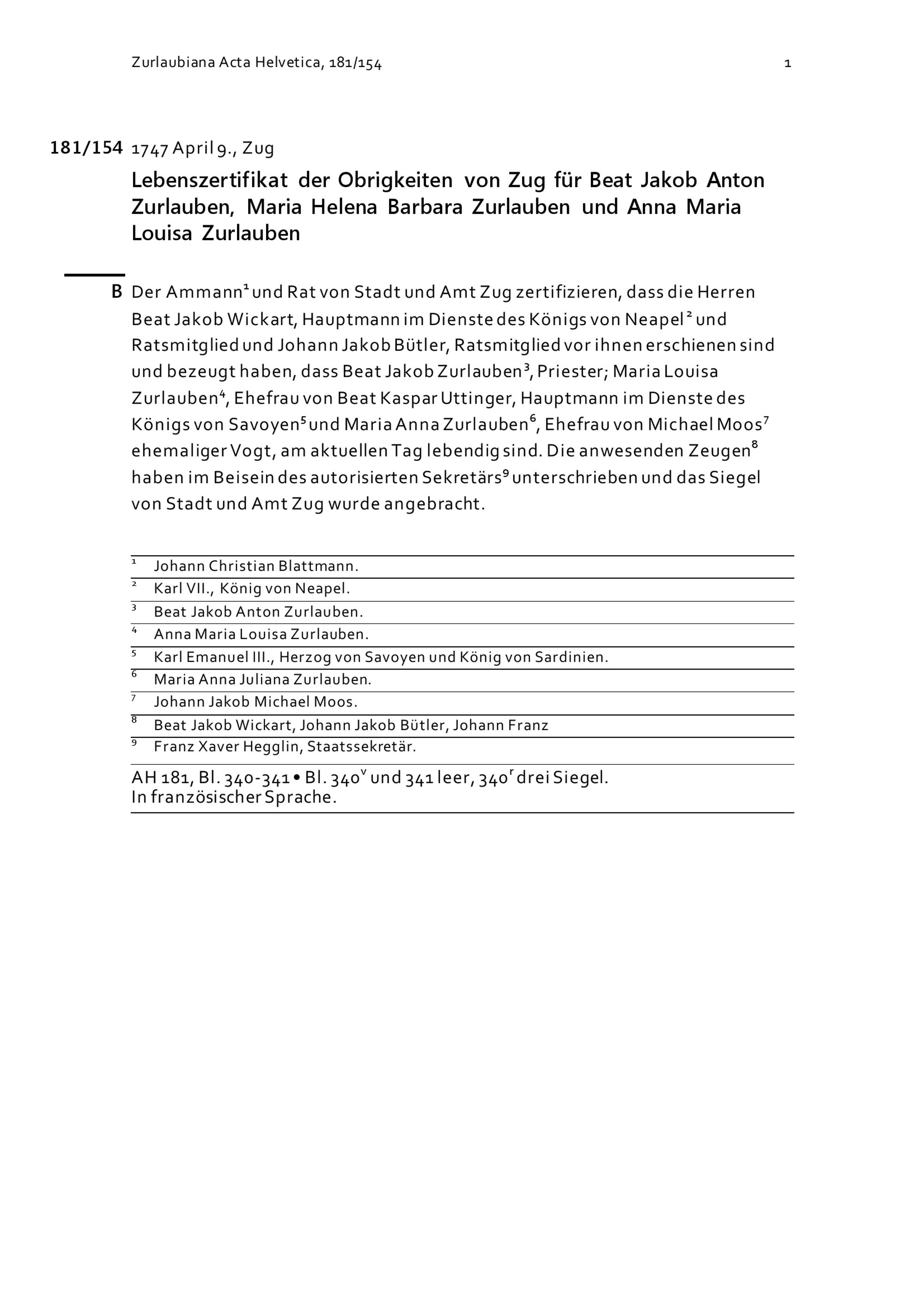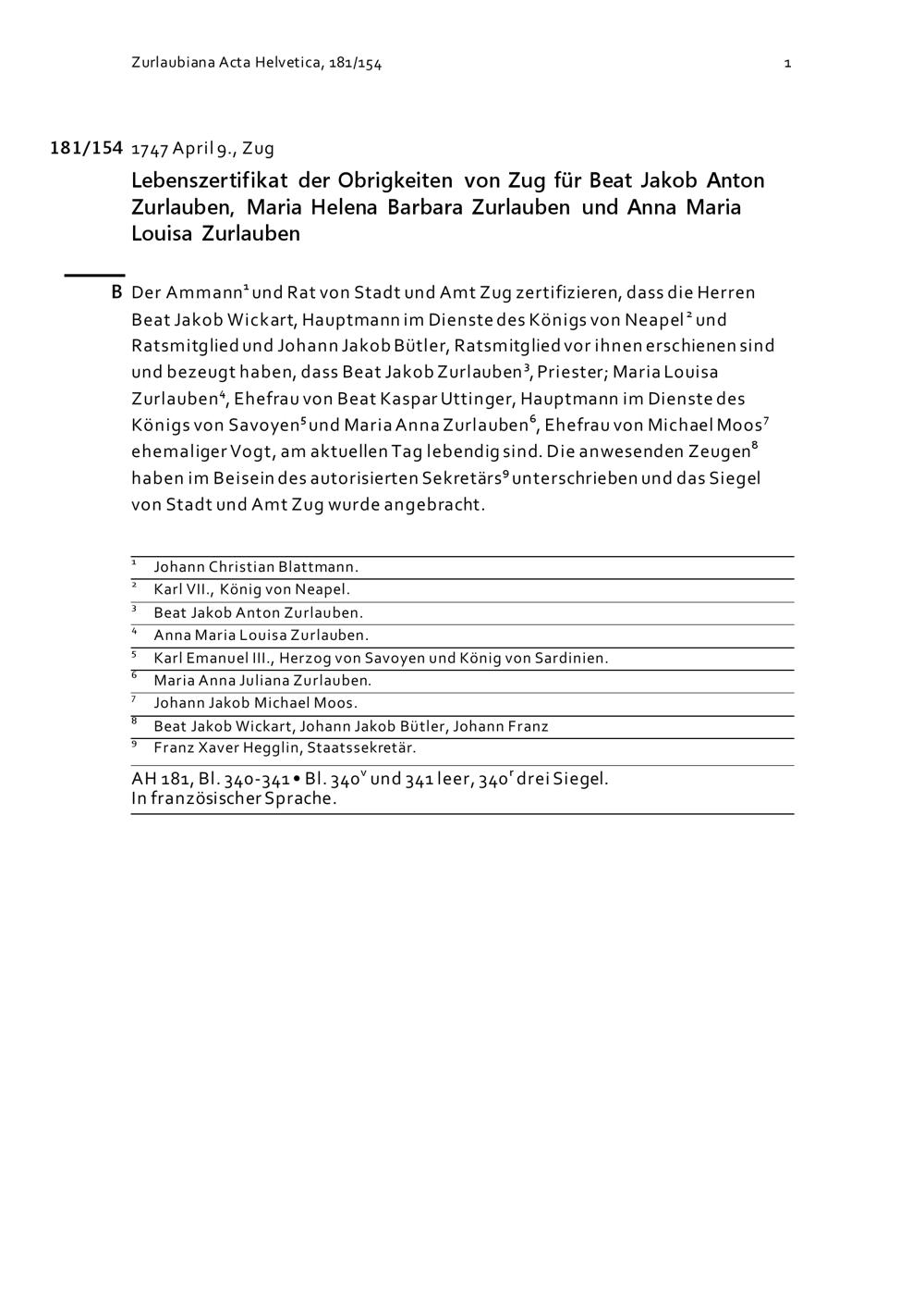Lebenszertifikat des Ammanns und Rats von Stadt und Amt Zug für Beat Jakob Anton Zurlauben, Maria Helena Barbara Zurlauben und Anna Maria Louisa Zurlauben