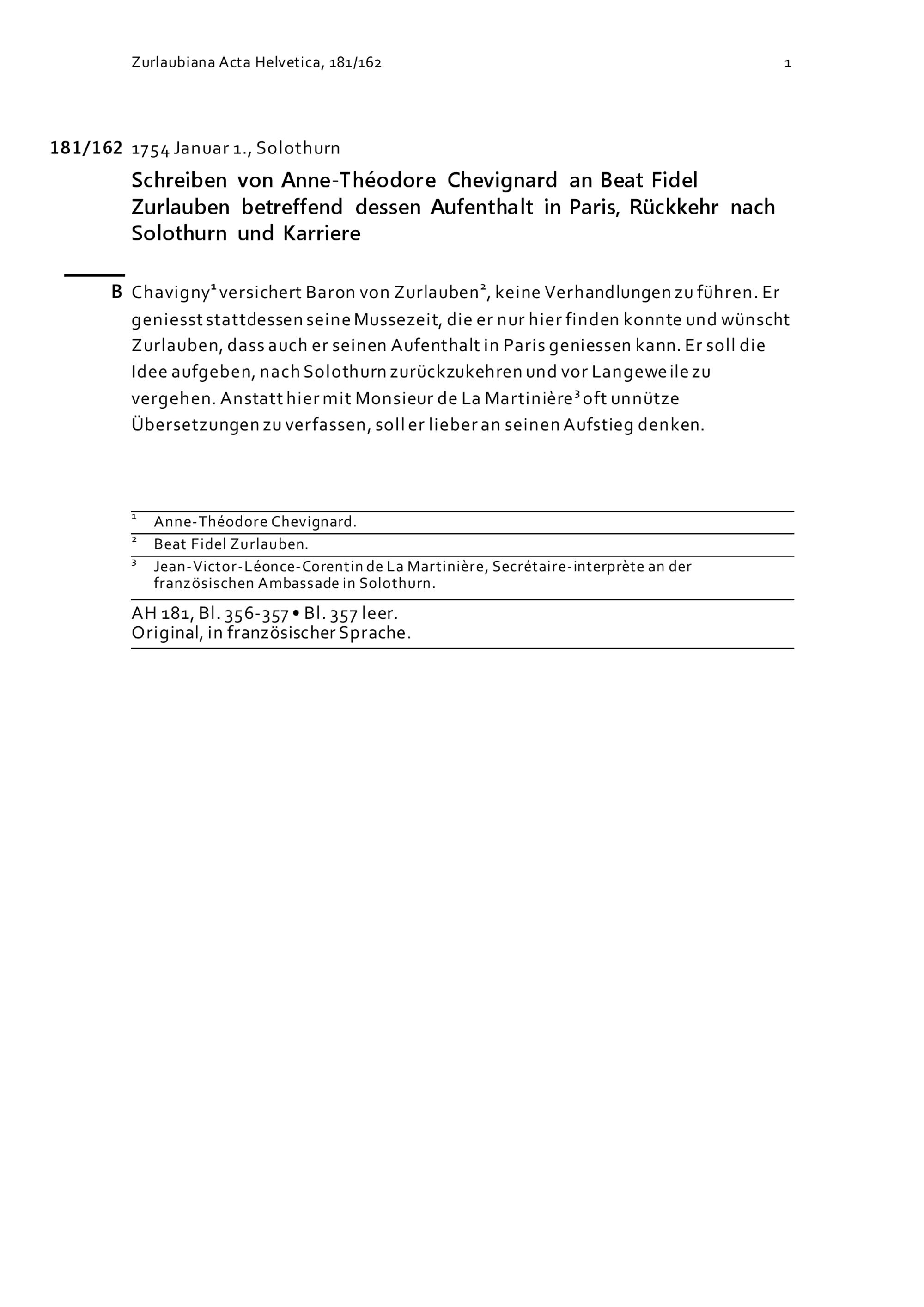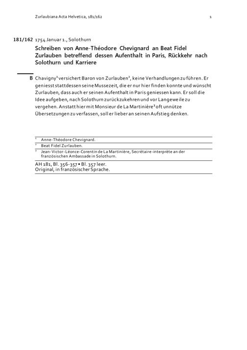 Schreiben von Anne-Théodore Chevignard an Beat Fidel Zurlauben betreffend dessen...