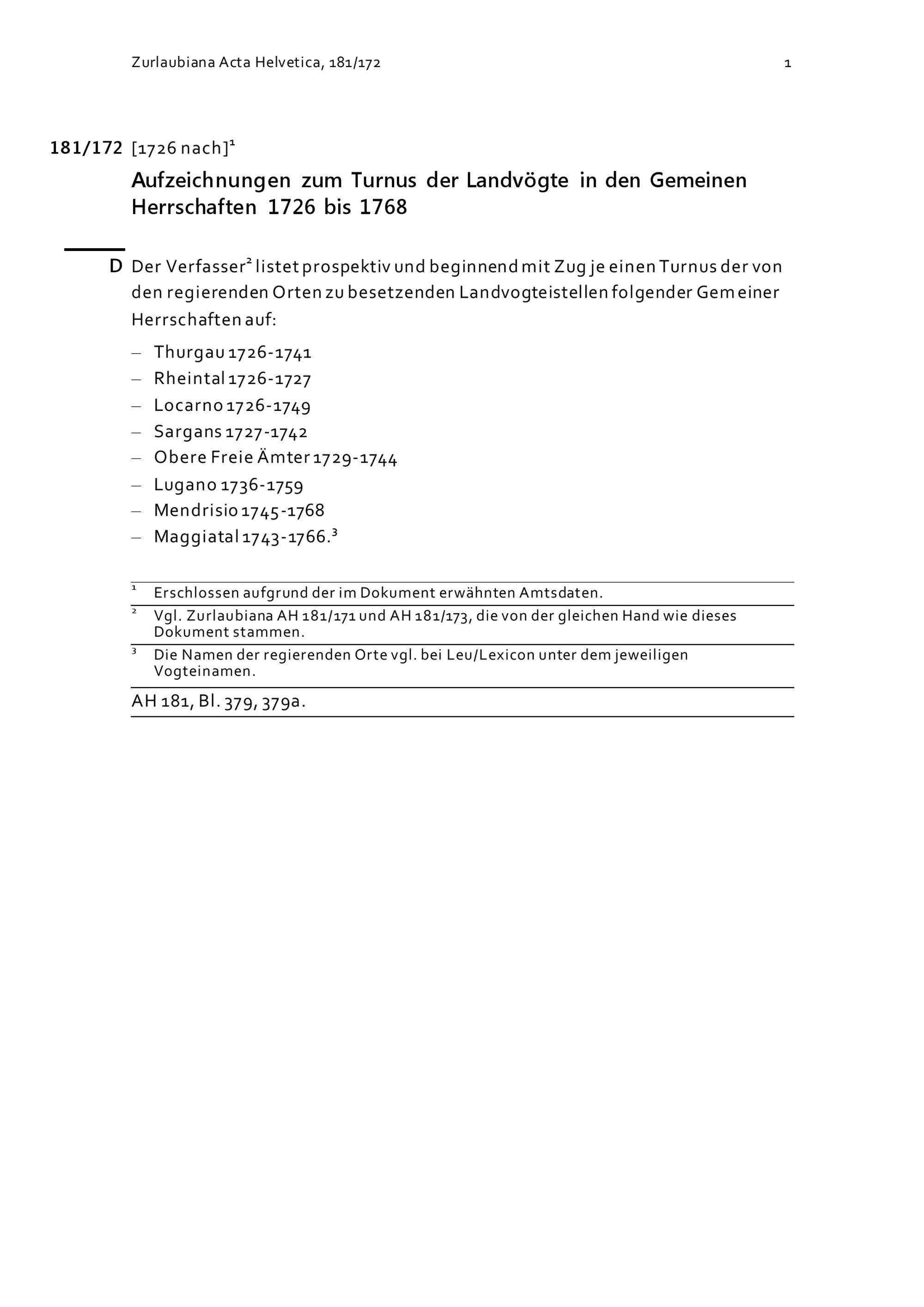 Aufzeichnungen zum Turnus der Landvögte in den Gemeinen Herrschaften 1726 bis 17...