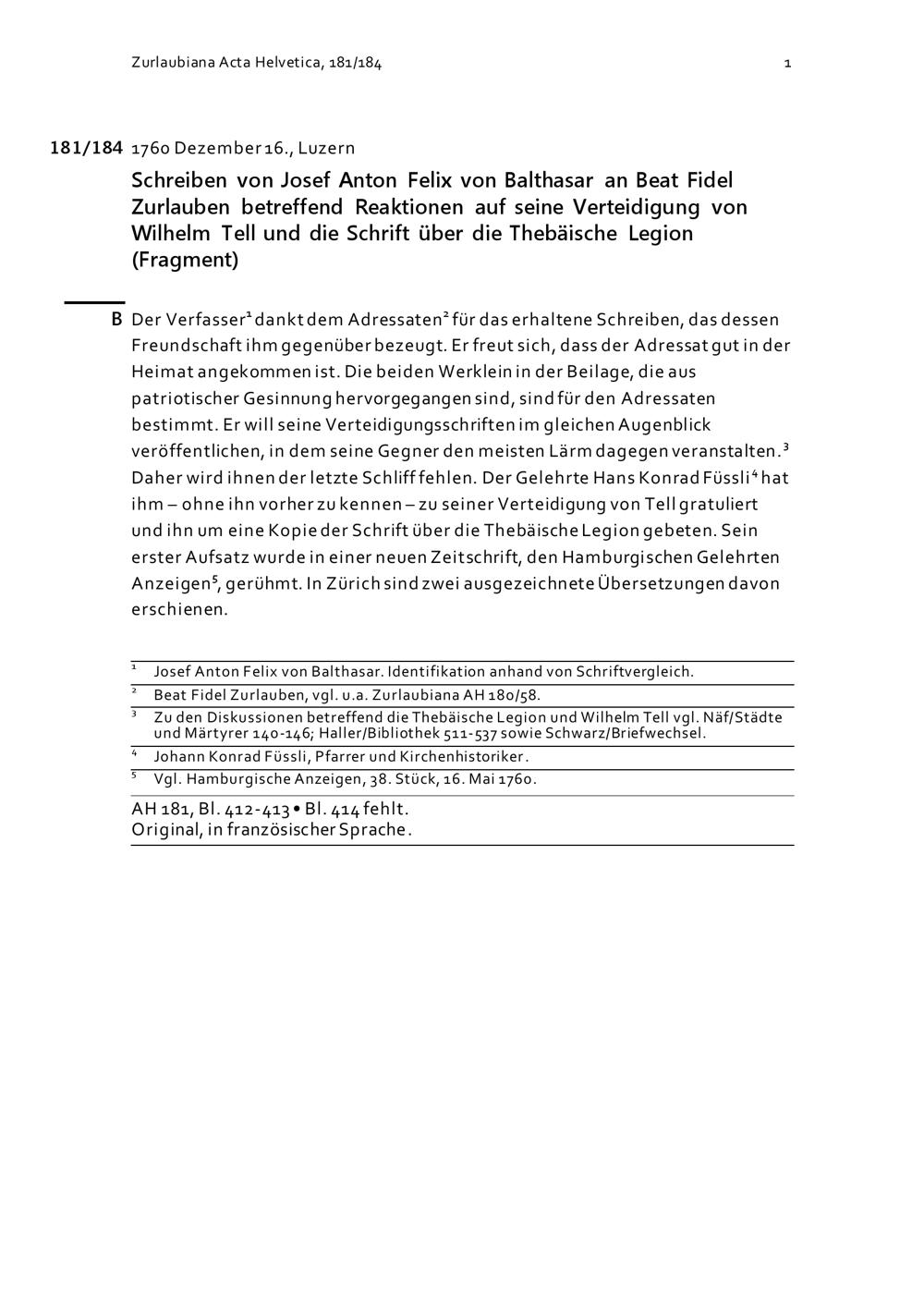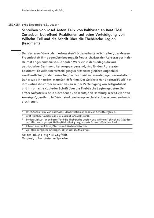 Schreiben von Josef Anton Felix von Balthasar an Beat Fidel Zurlauben betreffend Reaktionen auf seine Verteidigung von Wilhelm Tell und die Schrift über die Thebäische Legion