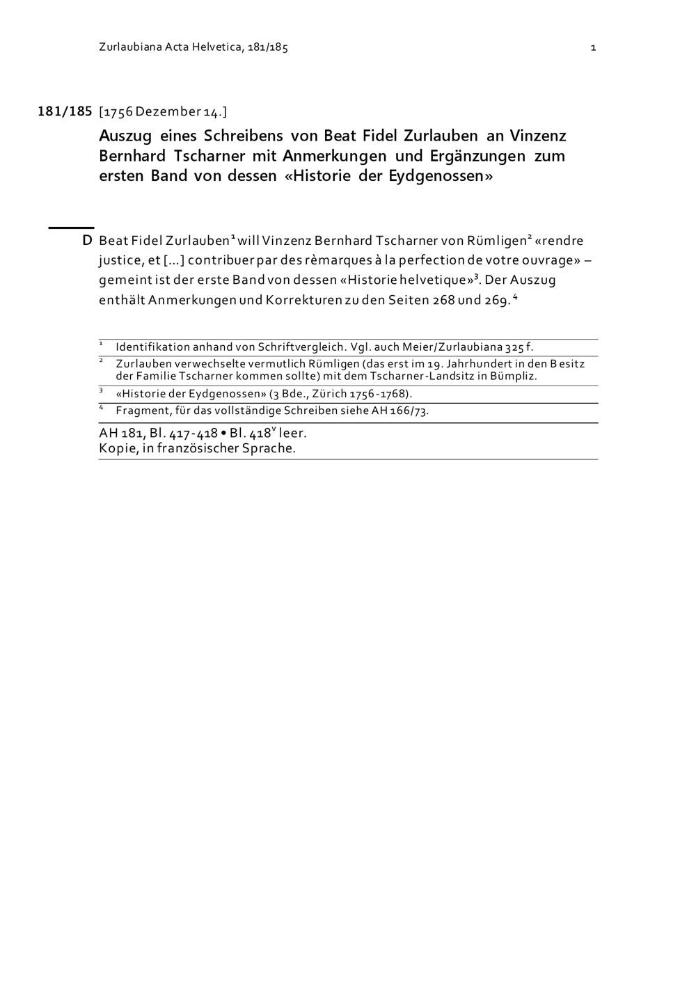 Auszug eines Schreiben von Beat Fidel Zurlauben an Vinzenz Bernhard Tscharner mit Anmerkungen und Ergänzungen zum ersten Band von dessen «Historie der Eydgenossen»