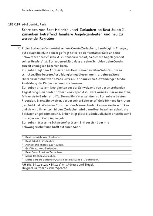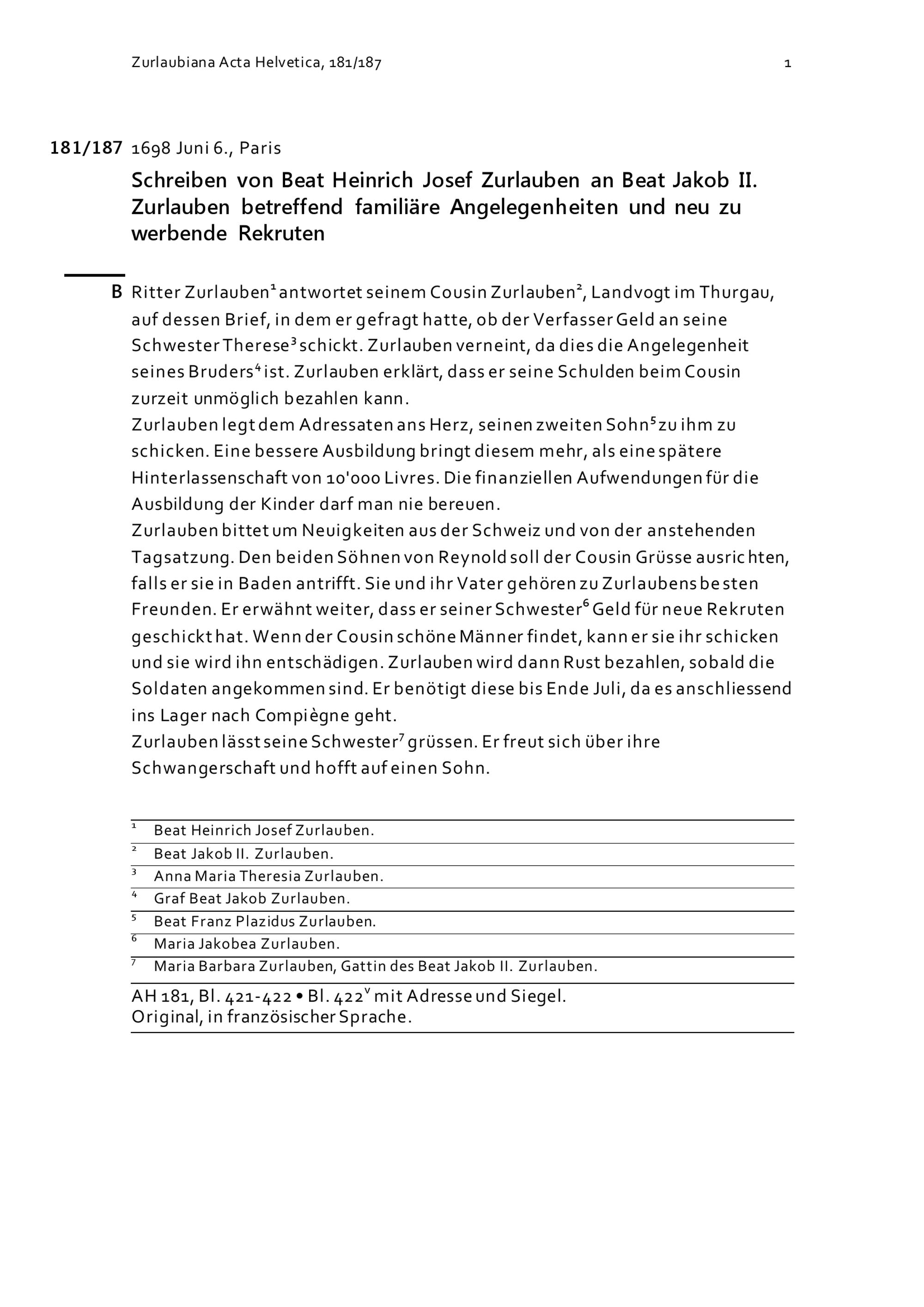 Schreiben von Beat Heinrich Josef Zurlauben an Beat Jakob II. Zurlauben betreffend familiäre Angelegenheiten und neu zu werbende Rekruten