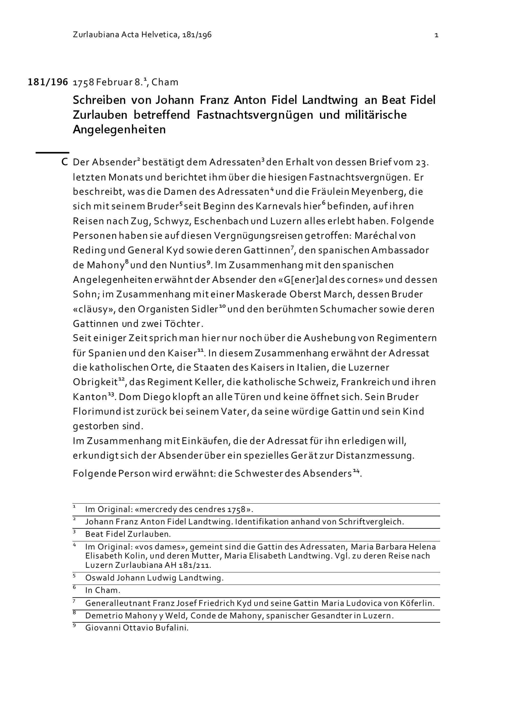Schreiben von Johann Franz Anton Fidel Landtwing an Beat Fidel Zurlauben betreffend Fastnachtsvergnügen und militärische Angelegenheiten