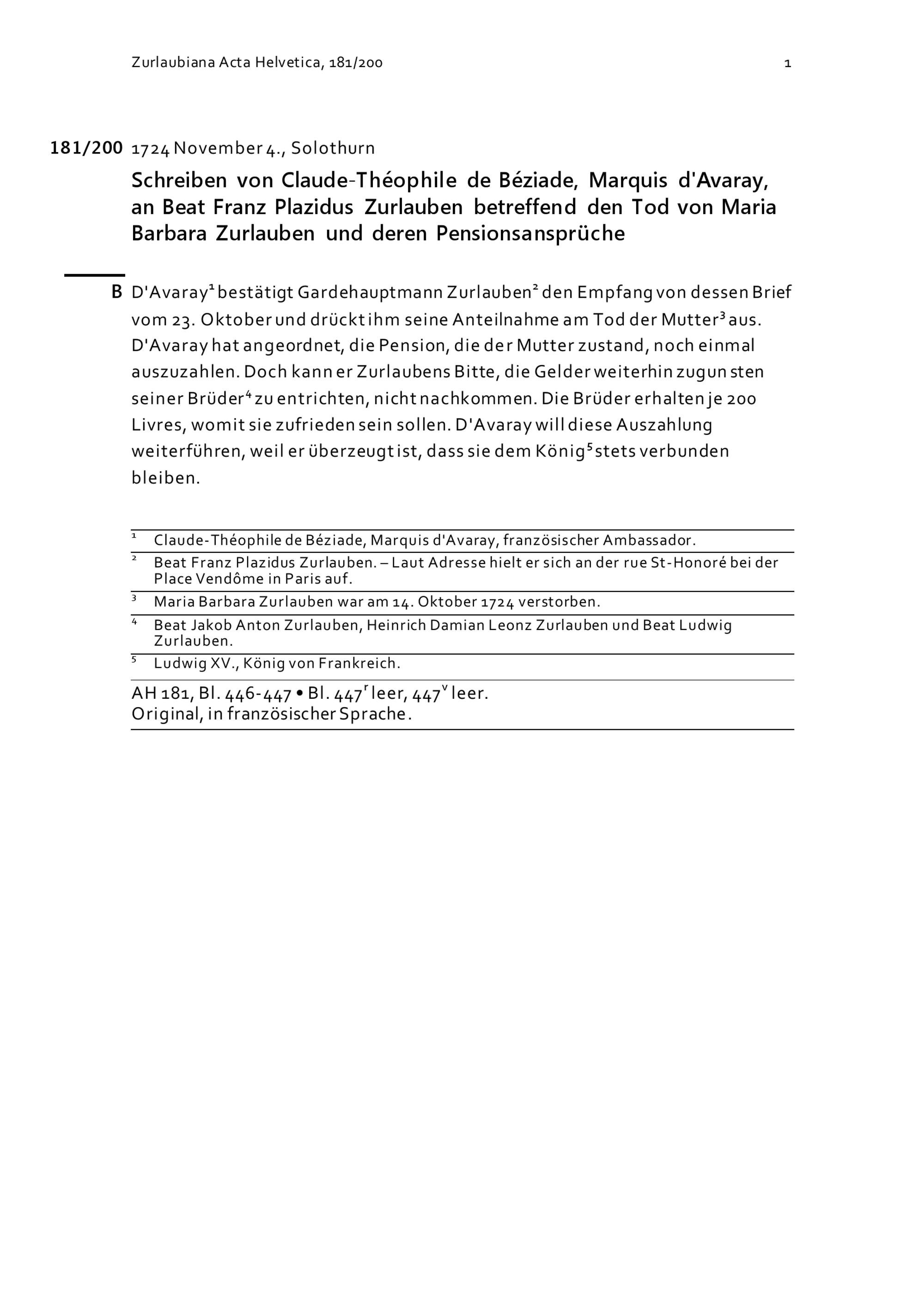 Schreiben von Claude-Théophile de Béziade, Marquis d'Avaray, an Beat Franz Plazidus Zurlauben betreffend den Tod von Maria Barbara Zurlauben und deren Pensionsansprüche