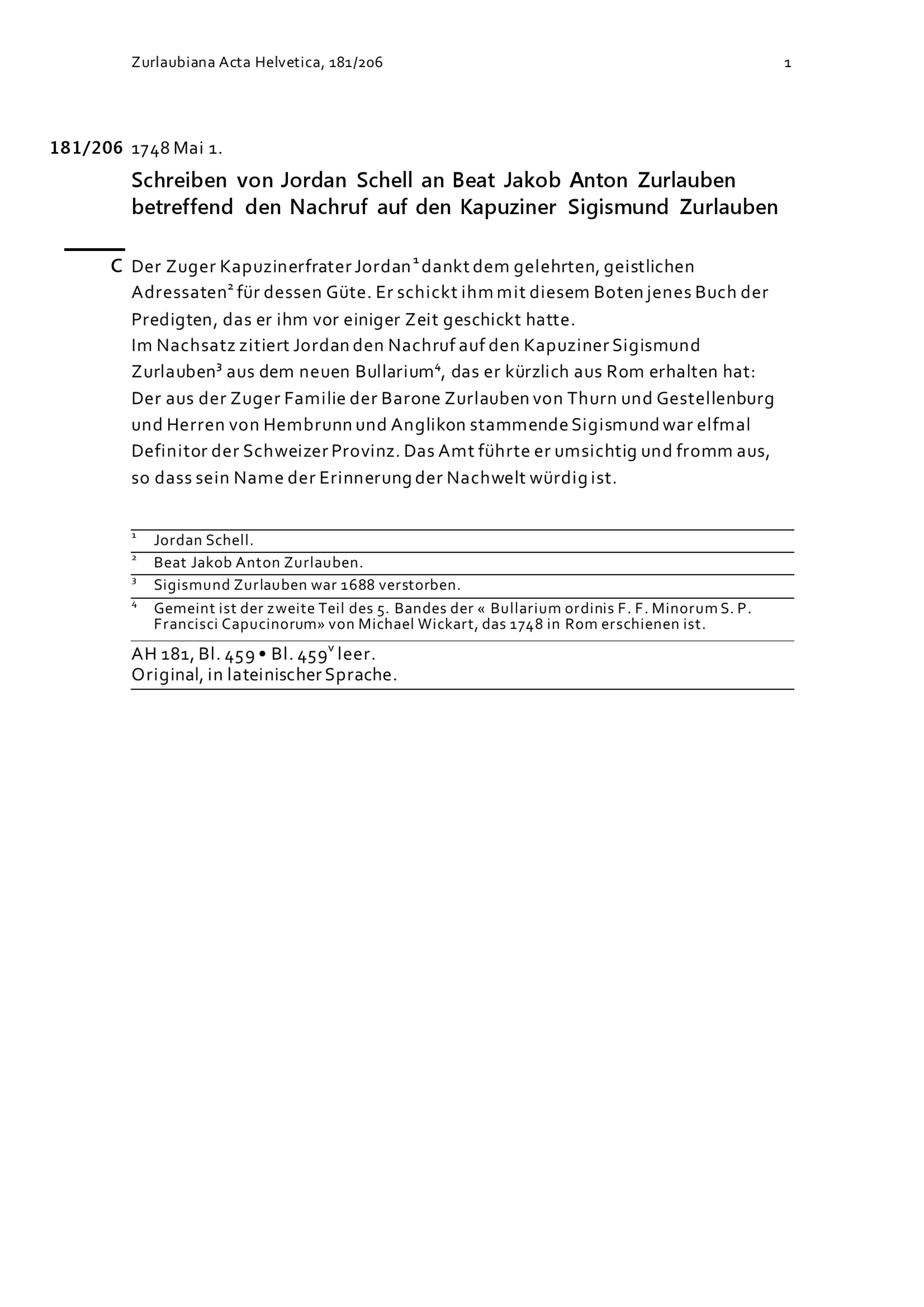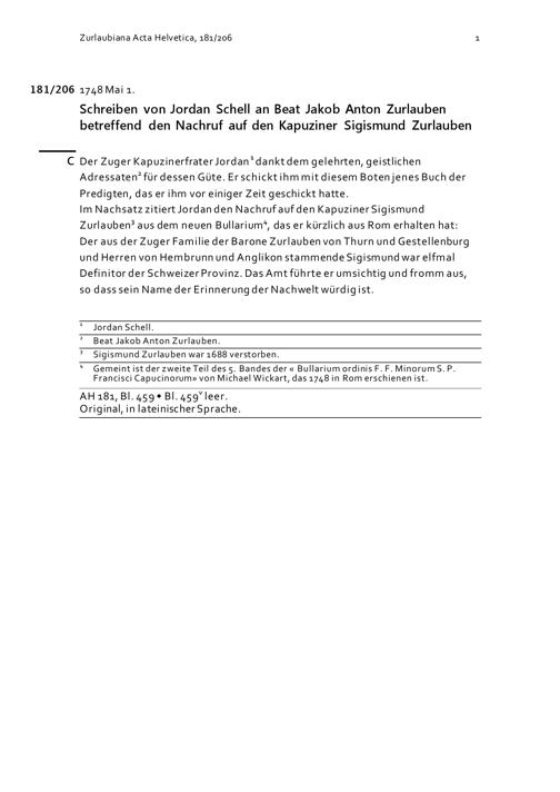 Schreiben von Jordan Schell an Beat Jakob Anton Zurlauben betreffend den Nachruf auf den Kapuziner Sigismund Zurlauben