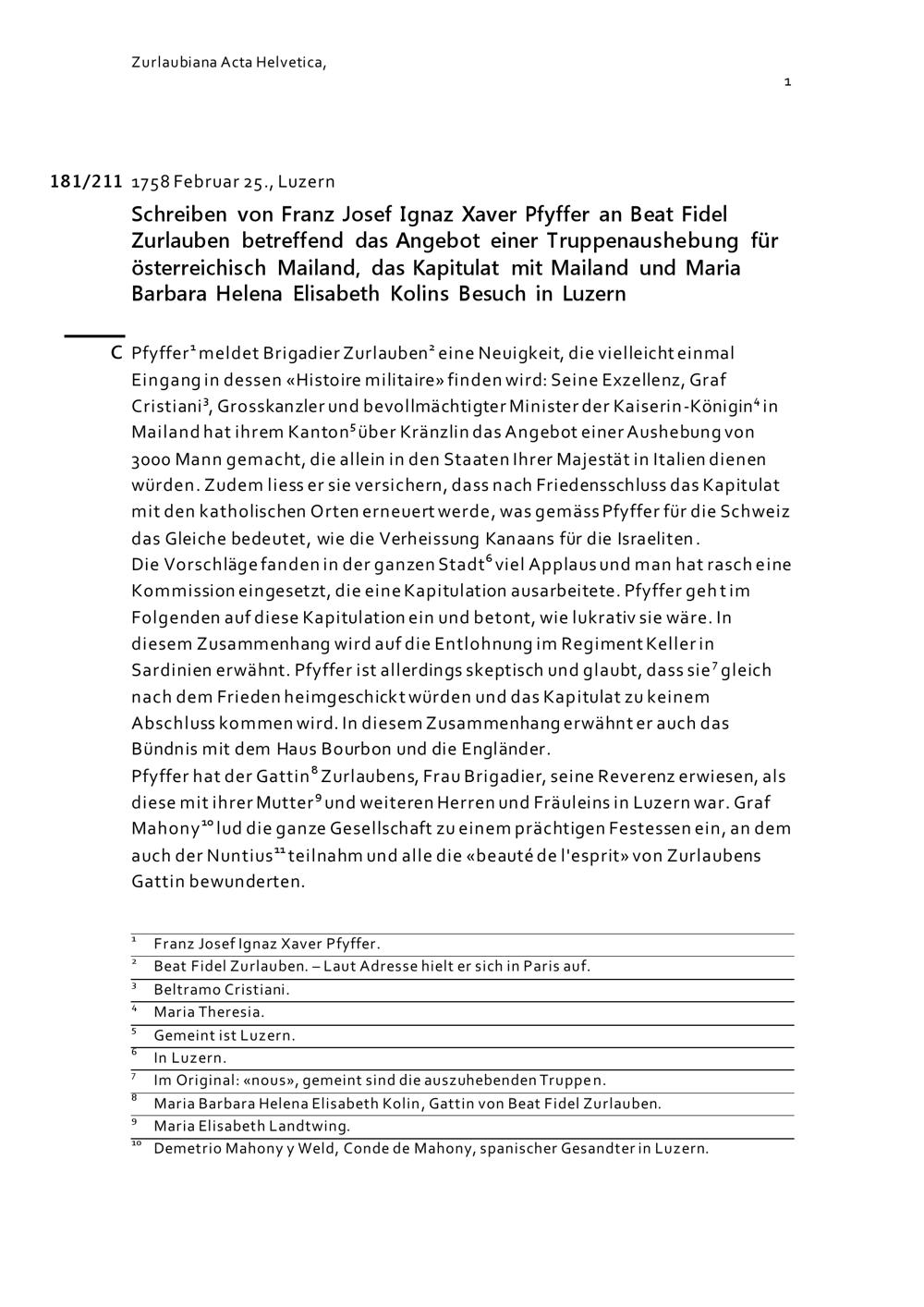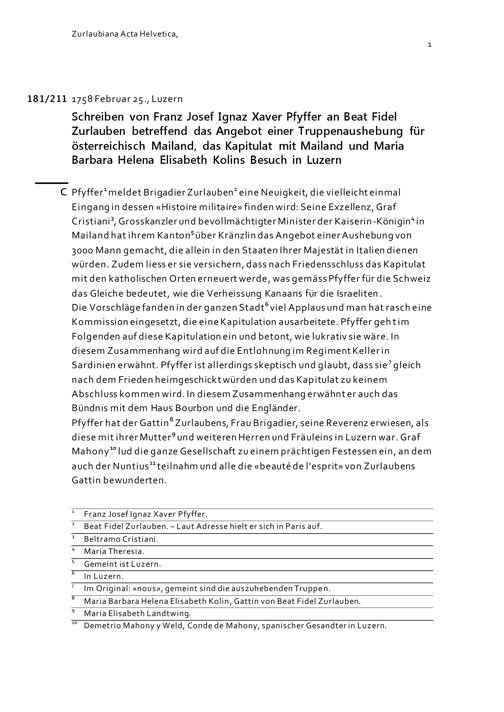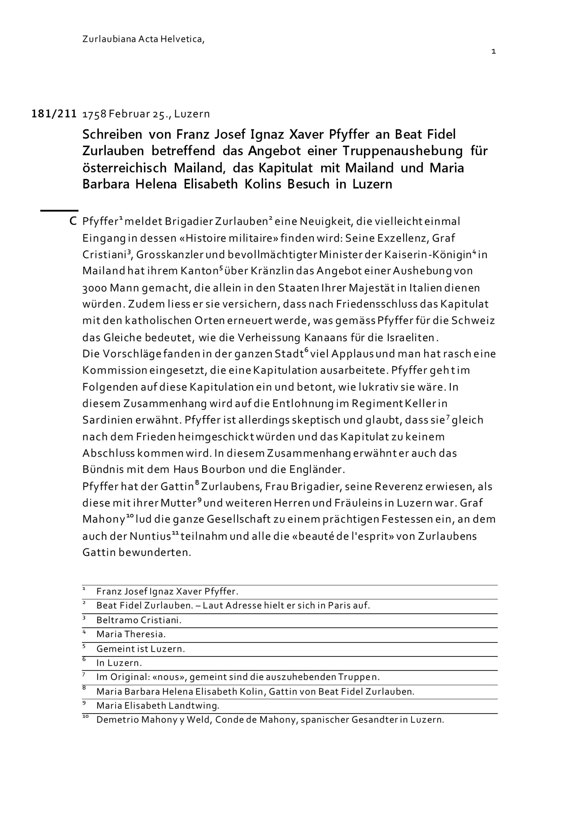 Schreiben von Franz Josef Ignaz Xaver Pfyffer an Beat Fidel Zurlauben betreffend das Angebot einer Truppenaushebung für österreichisch Mailand, das Kapitulat mit Mailand und Maria Barbara Helena Elisabeth Kolins Besuch in Luzern