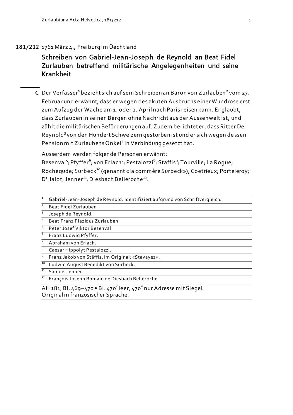 Schreiben von Gabriel-Jean-Joseph de Reynold an Beat Fidel Zurlauben betreffend militärische Angelegenheiten und seine Krankheit