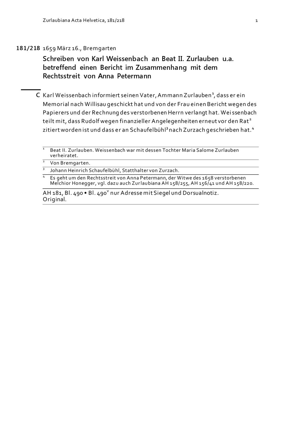 Schreiben von Karl Weissenbach an Beat II. Zurlauben u.a. betreffend einen Bericht in Zusammenhang mit dem Rechtsstreit von Anna Petermann