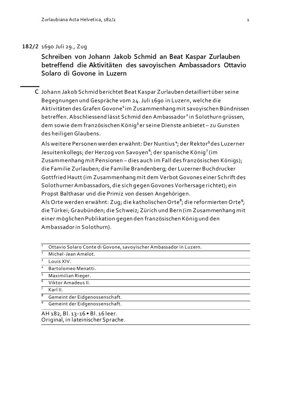 Schreiben von Johann Jakob Schmid an Beat Kaspar Zurlauben betreffend die Aktivitäten von Ottavio Solaro di Govone, Ambassador von Savoyen, in Luzern