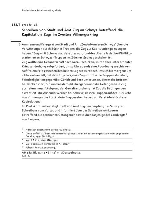 Schreiben von Stadt und Amt Zug an Schwyz betreffend die Kapitulation Zugs im Zweiten Villmergerkrieg