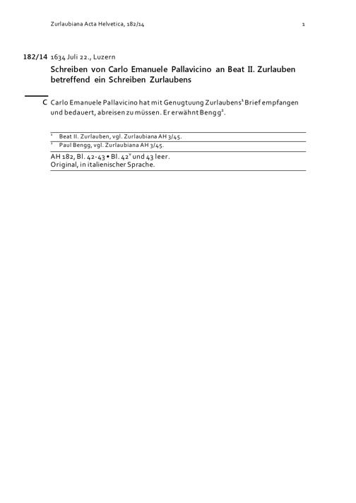 Schreiben von Carlo Emanuele Pallavicino an Beat II. Zurlauben betreffend ein Schreiben Zurlaubens