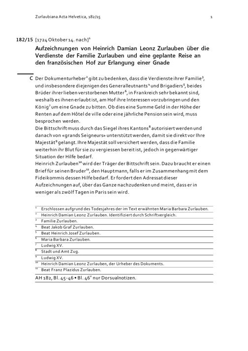 Aufzeichnungen von Heinrich Damian Leonz Zurlauben über die Verdienste der Familie...