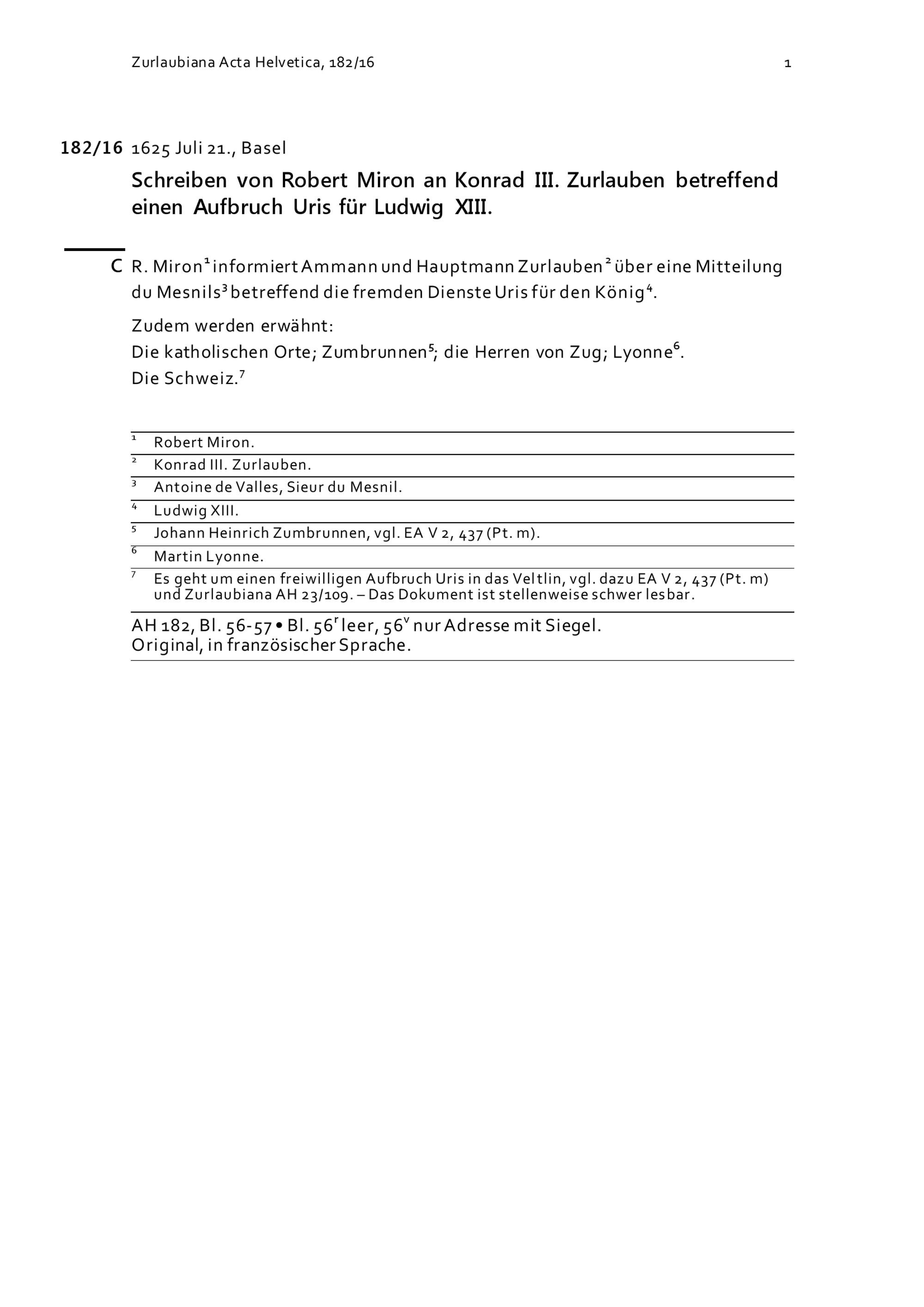 Schreiben von Robert Miron an Konrad III. Zurlauben betreffend einen Aufbruch Uris für Ludwig XIII.
