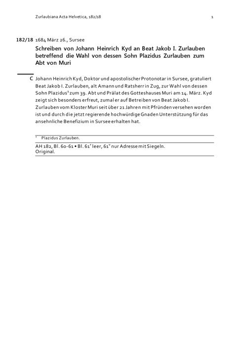 Schreiben von Johann Heinrich Kyd an Beat Jakob I. Zurlauben betreffend die Wahl von dessen Sohn Plazidus Zurlauben zum Abt von Muri