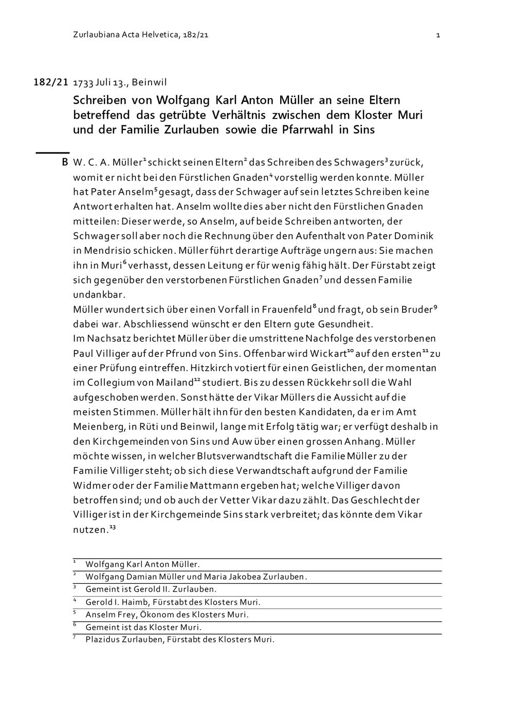 Schreiben von Wolfgang Karl Anton Müller an seine Eltern betreffend das getrübte Verhältnis zwischen der Familie Zurlauben und dem Kloster Muri sowie die Pfarrwahl in Sins