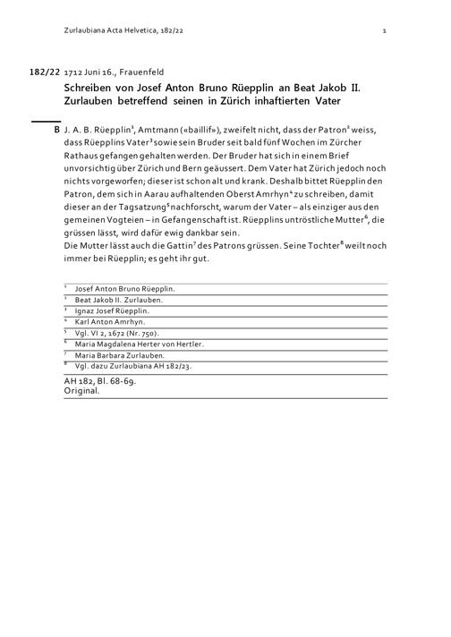 Schreiben von Josef Anton Bruno Rüepplin an Beat Jakob II. Zurlauben betreffend seinen in Zürich inhaftierten Vater