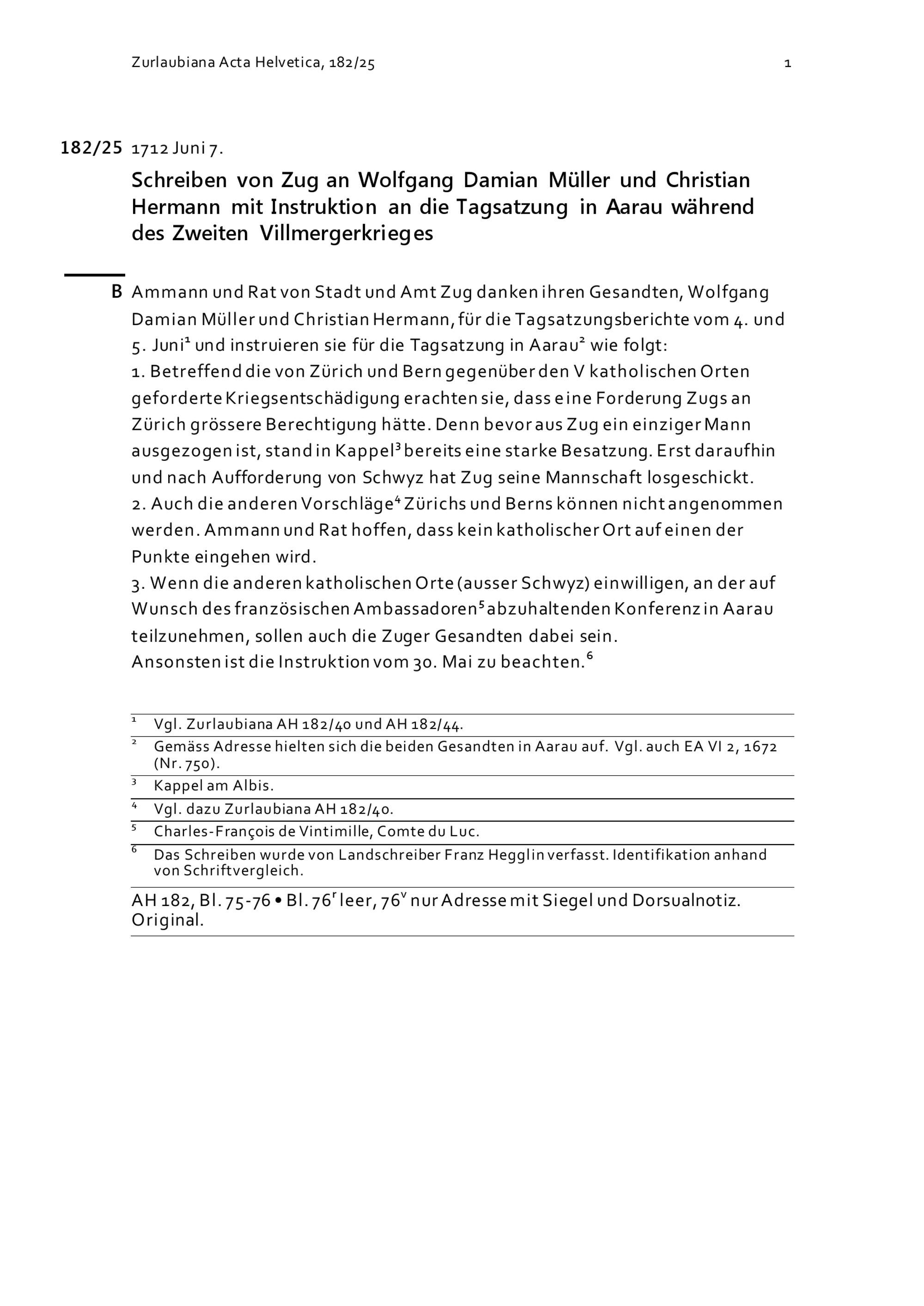 Schreiben von Stadt und Amt Zug an Wolfgang Damian Müller und Christian Hermann mit Instruktion an die Tagsatzung in Aarau während des Zweiten Villmergerkriegs