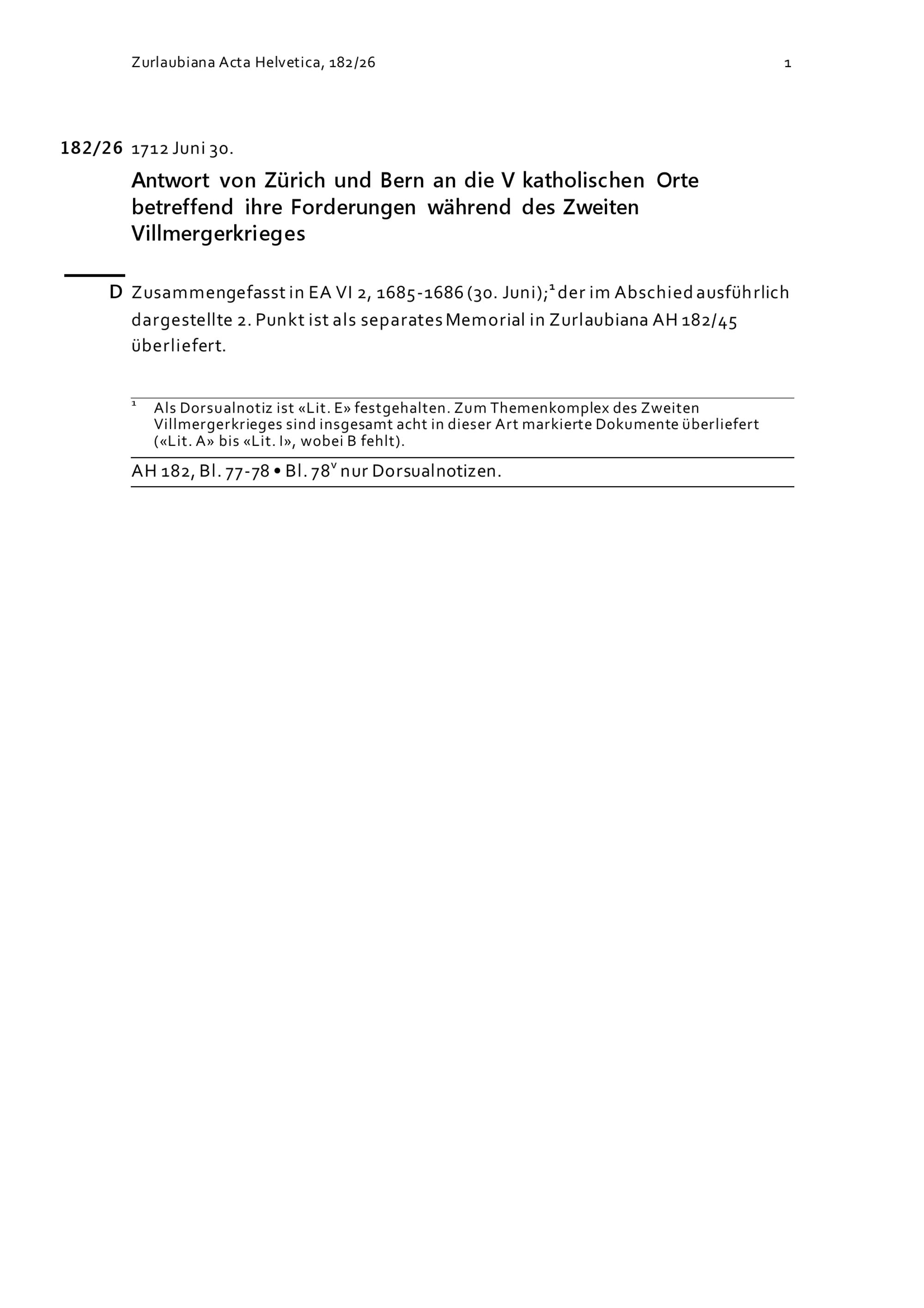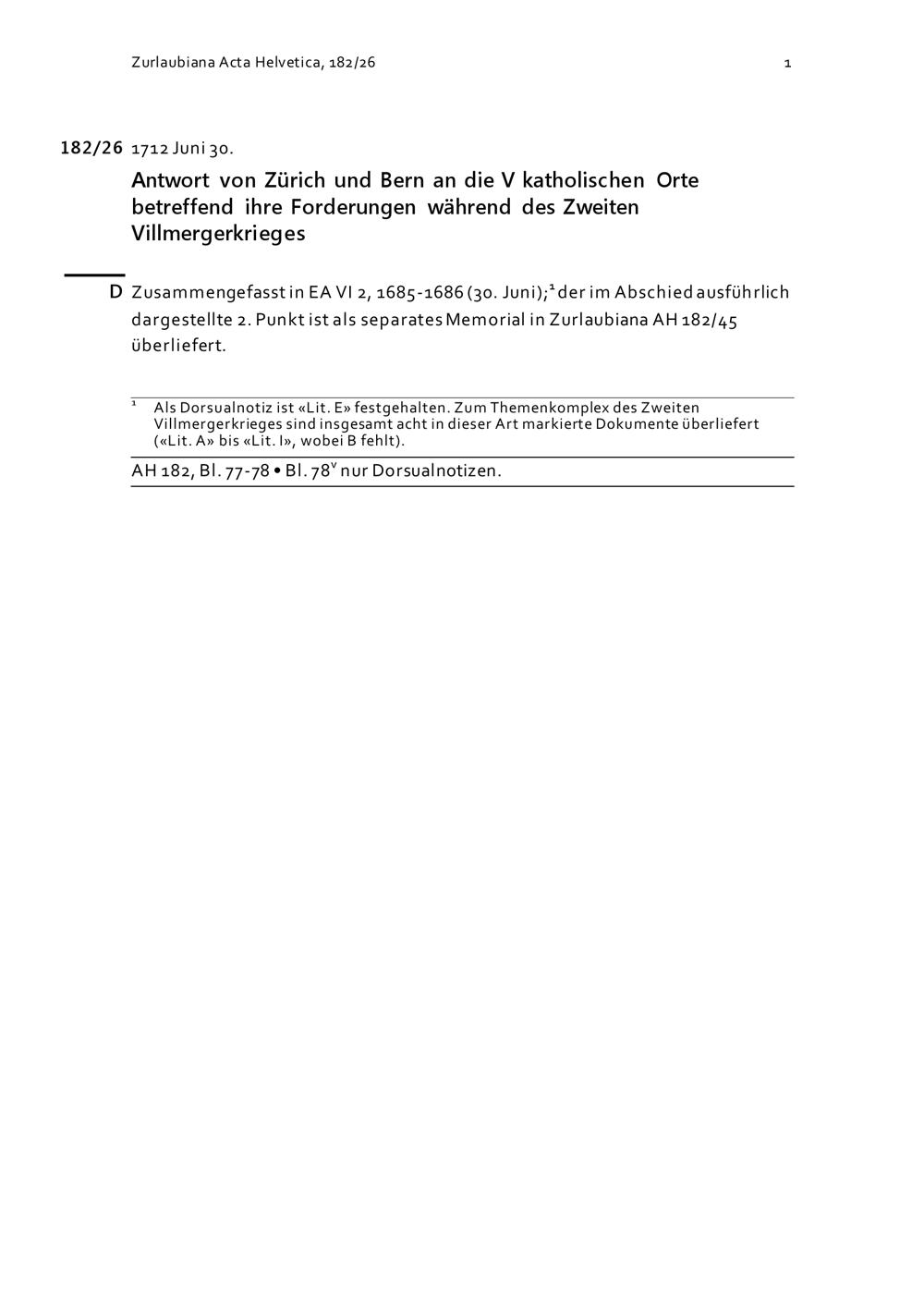 Antwort Zürichs und Berns auf die Erklärungen der Fünf Katholischen Orte betreffend die Forderungen im Zweiten Villmergerkrieg