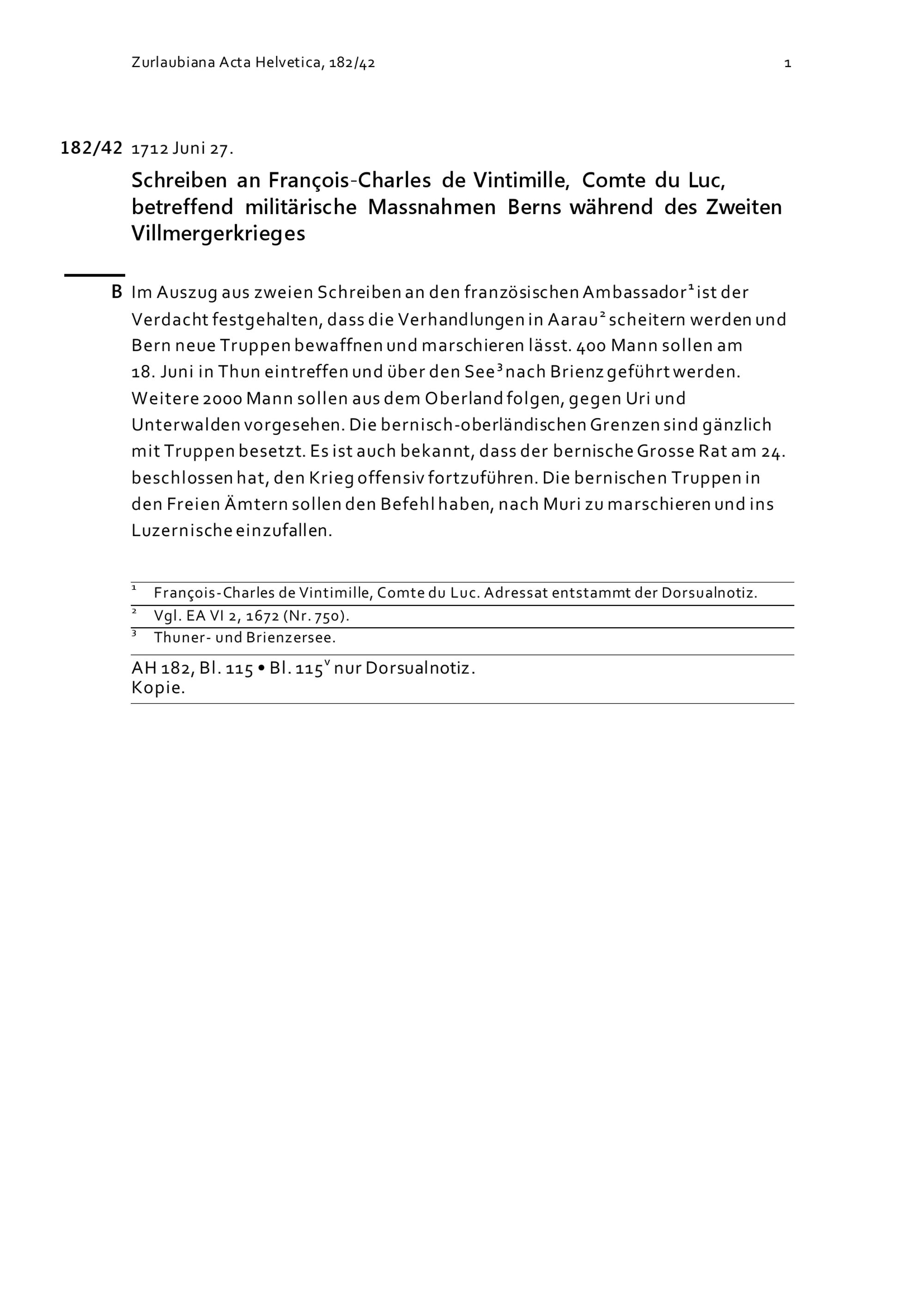 Schreiben an François-Charles de Vintimille, Graf du Luc, betreffend militärische Massnahmen Berns während des Zweiten Villmergerkriegs