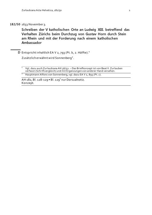 Schreiben der Fünf Katholischen Orte an Ludwig XIII. betreffend das Verhalten Zürichs beim Durchzug von Gustav Horn durch Stein am Rhein und mit der Forderung nach einem katholischen Ambassador