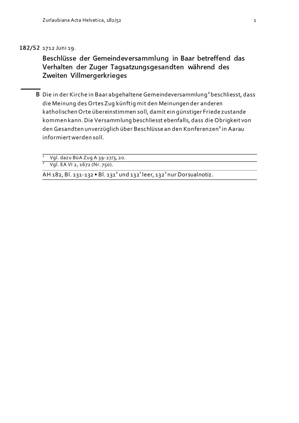 Beschlüsse der Gemeindeversammlung in Baar bezüglich des Verhaltens der Zuger Tagsatzungsgesandten während des Zweiten Villmergerkriegs