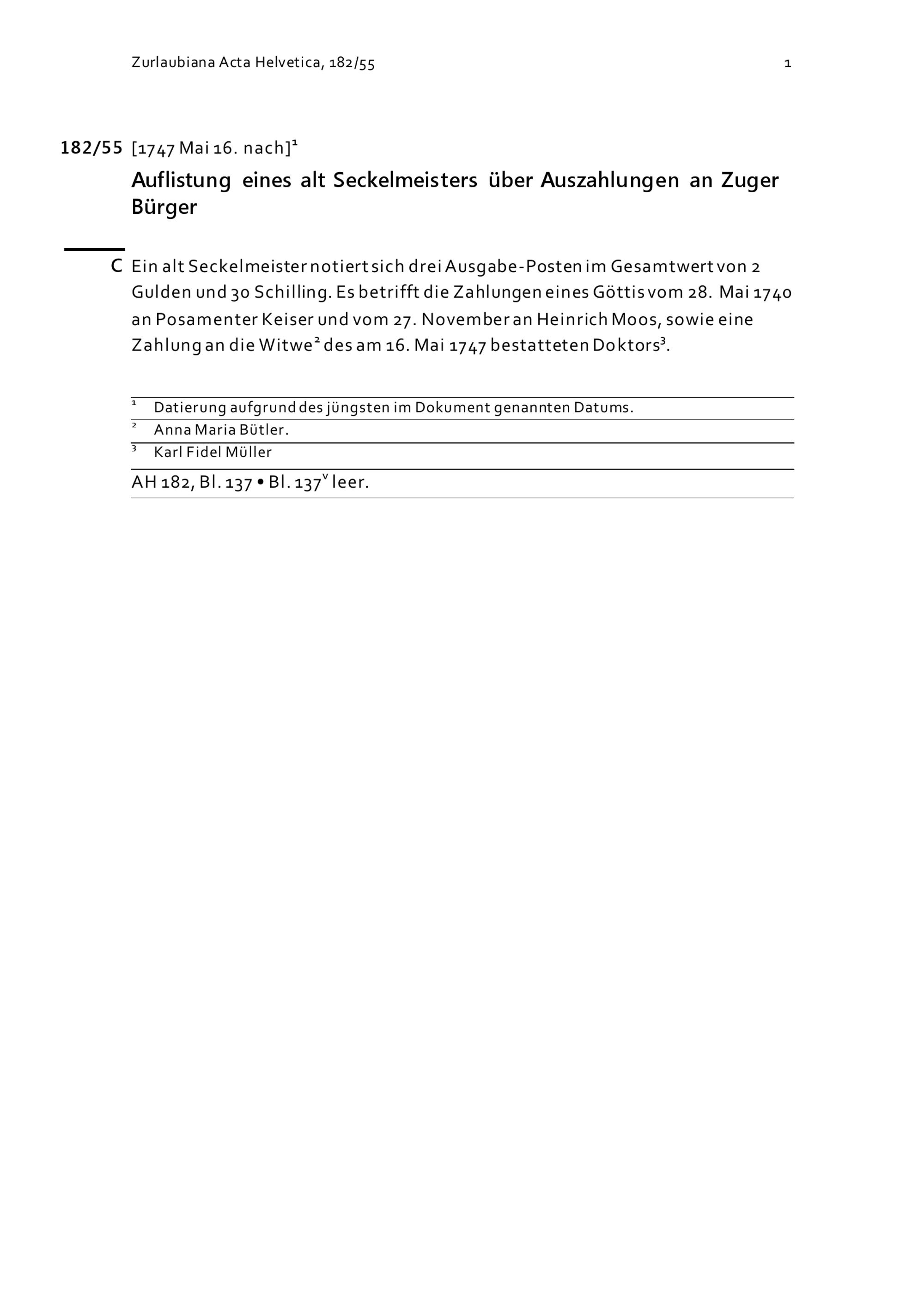 Auszahlungen eines Altseckelmeisters an Zuger Bürger