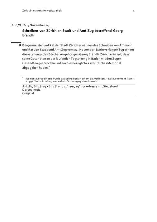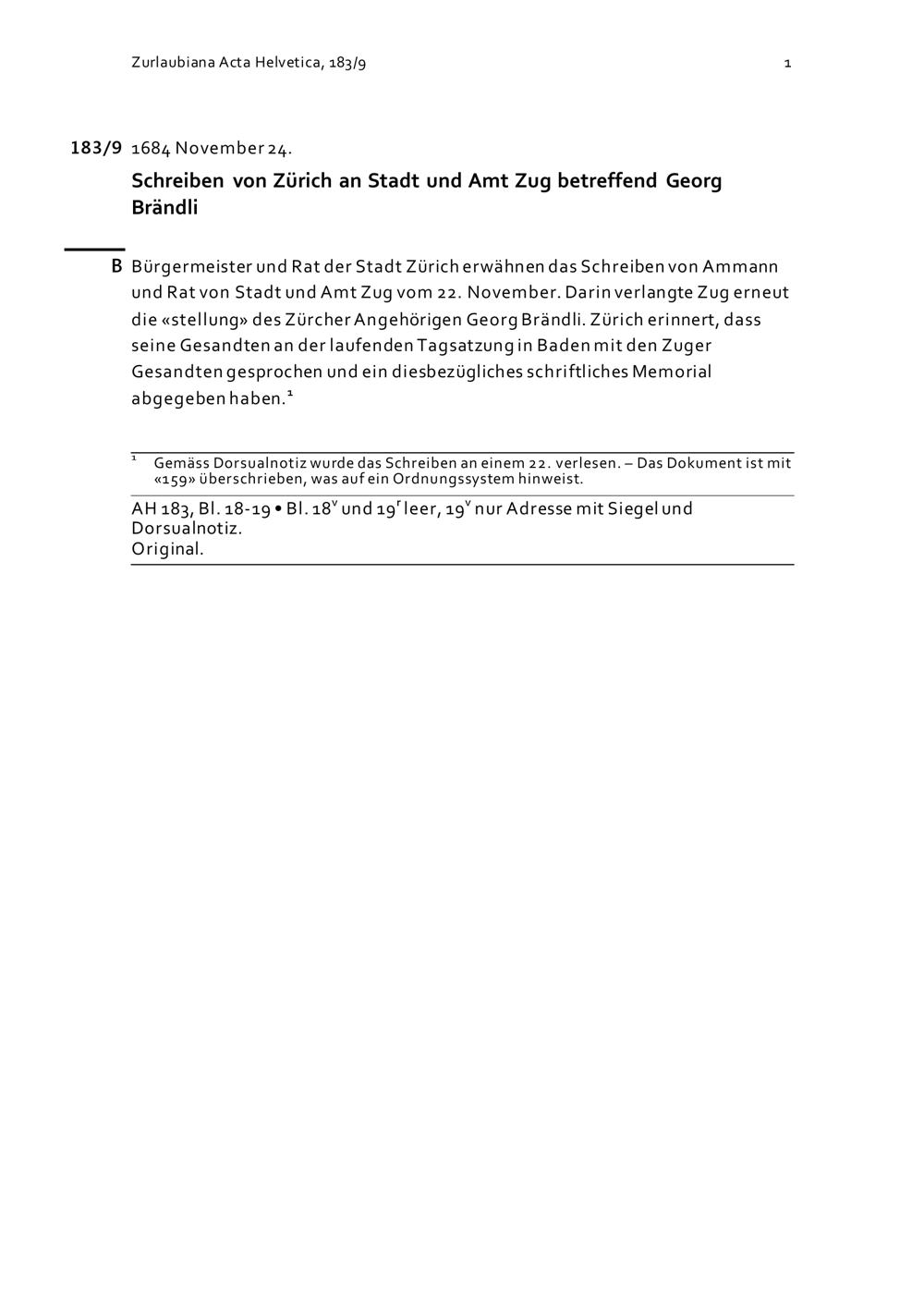 Schreiben von Zürich an Stadt und Amt Zug betreffend Georg Brändli
