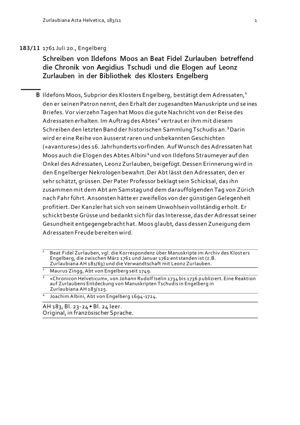 Schreiben von Ildefons Moos an Beat Fidel Zurlauben betreffend die Chronik von Aegidius Tschudi und die Elogen auf Leonz Zurlauben in der Bibliothek des Klosters Engelberg