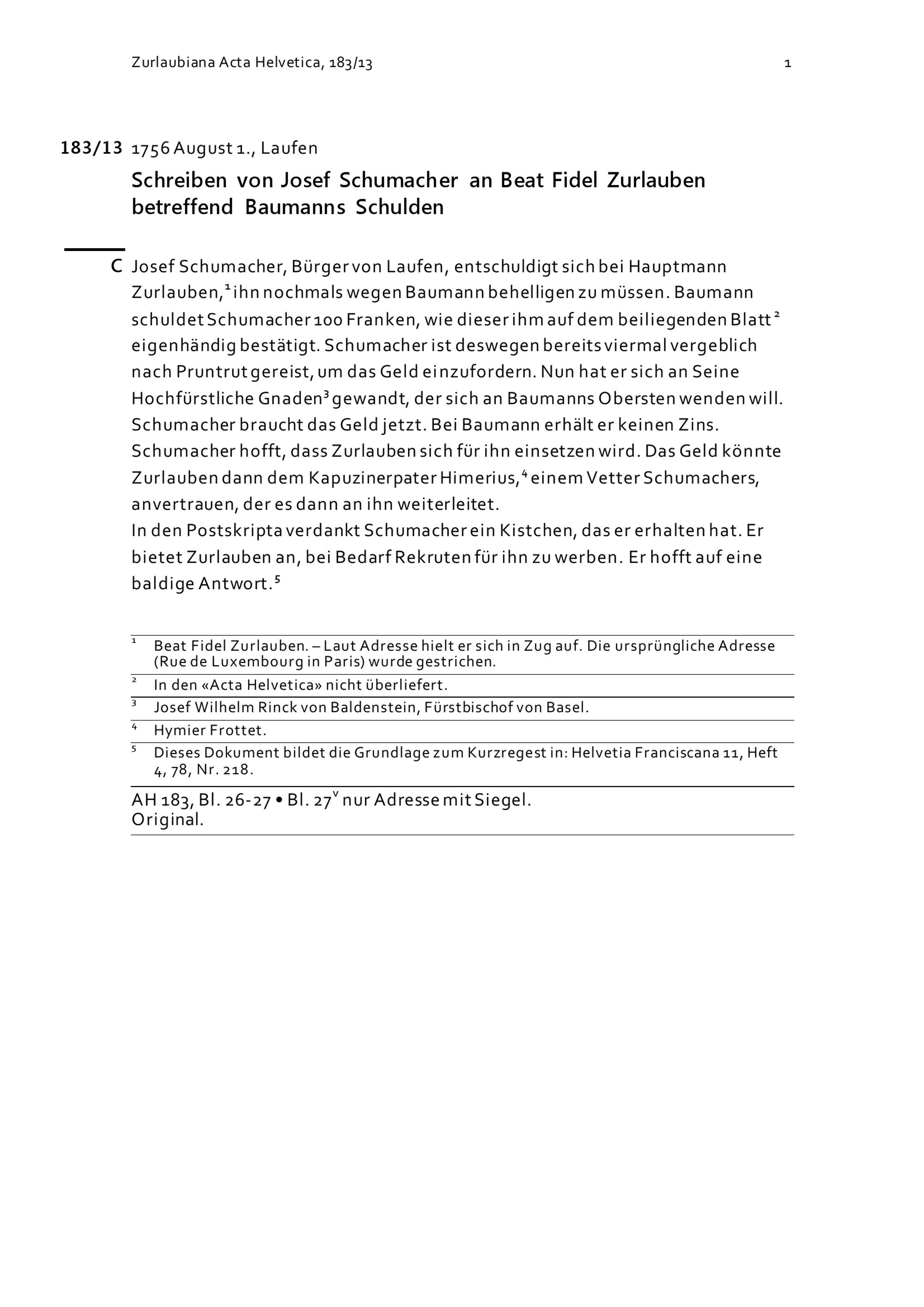 Schreiben von Josef Schumacher an Beat Fidel Zurlauben betreffend Baumanns Schulden