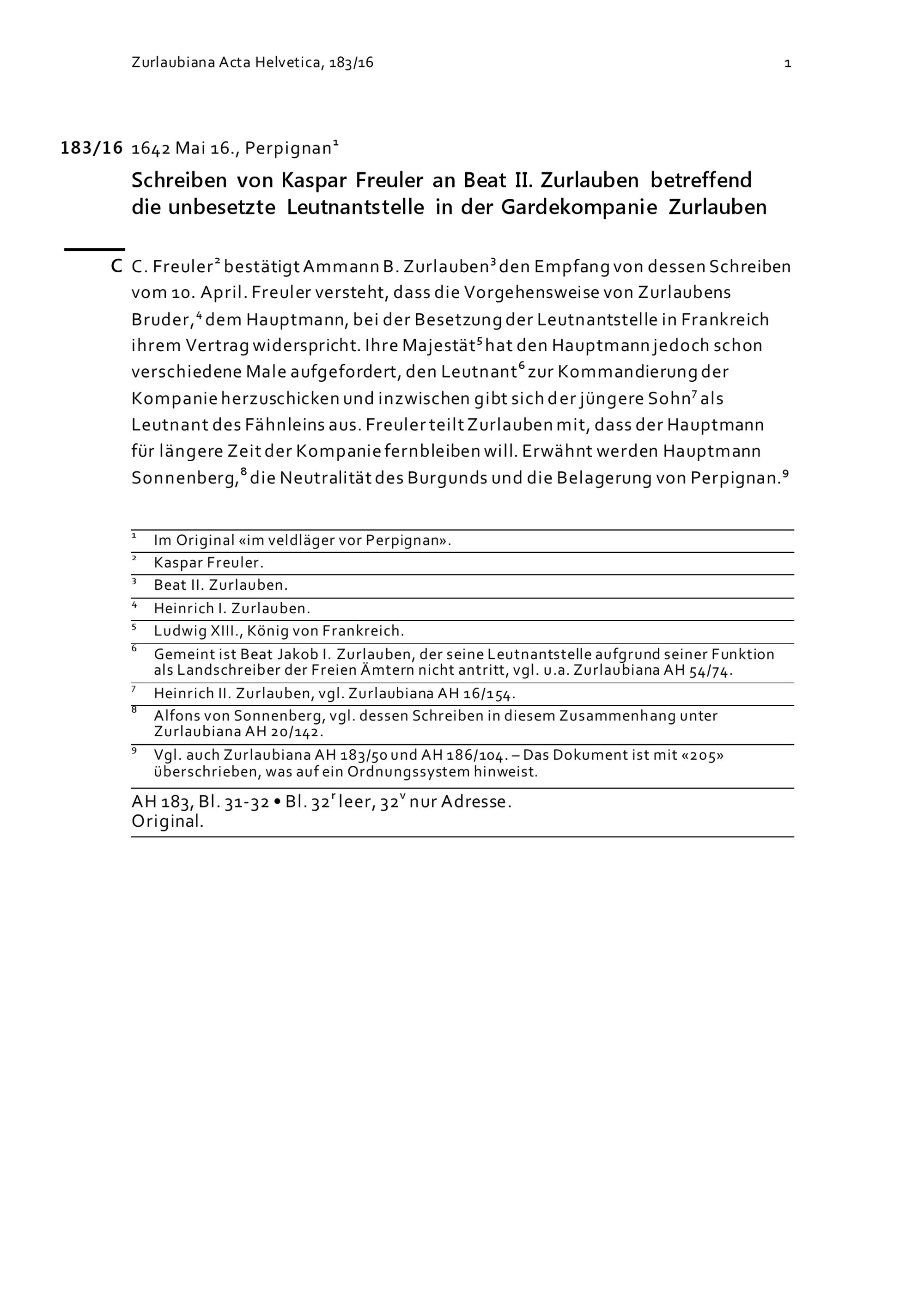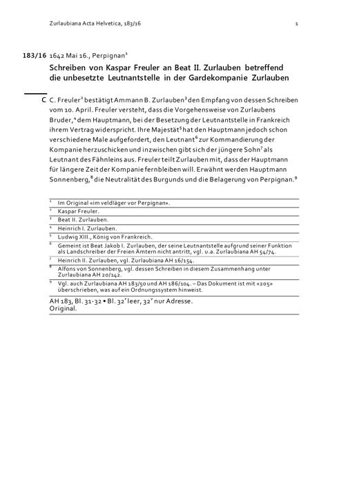 Schreiben von Kaspar Freuler an Beat II. Zurlauben betreffend die unbesetzte Leutnantstelle in der Gardekompanie Zurlauben