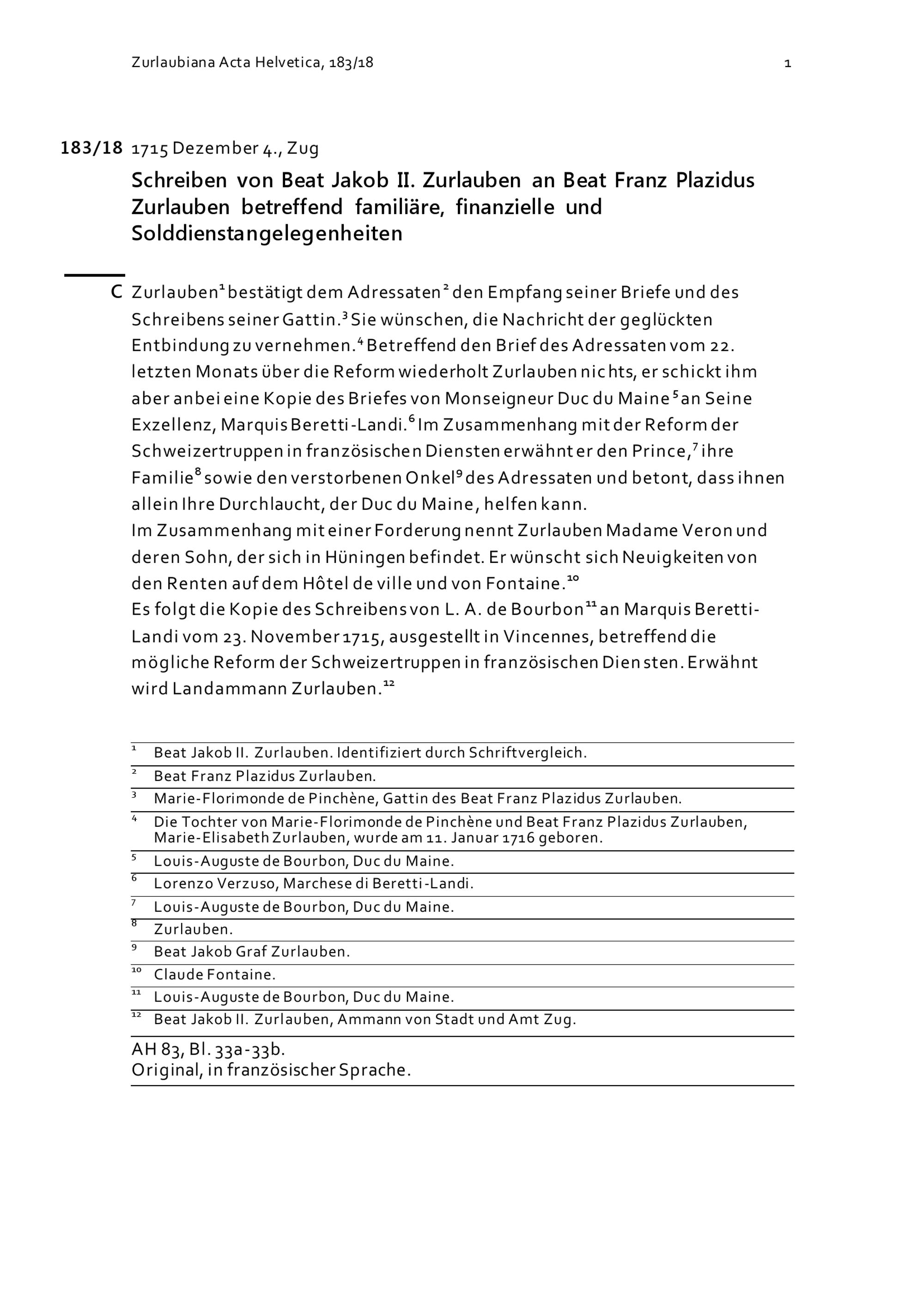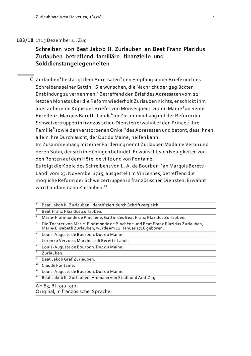 Schreiben von Beat Jakob II. Zurlauben an Beat Franz Plazidus Zurlauben betreffend...