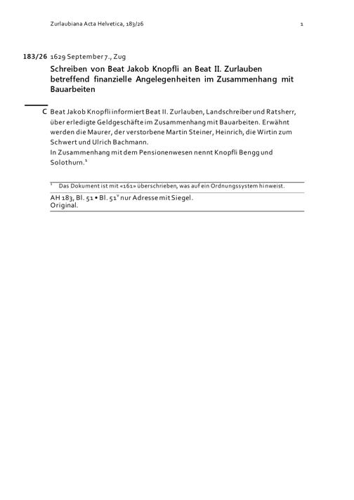 Schreiben von Beat Jakob Knopfli an Beat II. Zurlauben betreffend finanzielle Angelegenheiten...