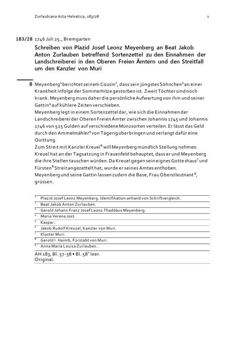 Schreiben von Plazid Josef Leonz Meyenberg an Beat Jakob Anton Zurlauben betreffend...