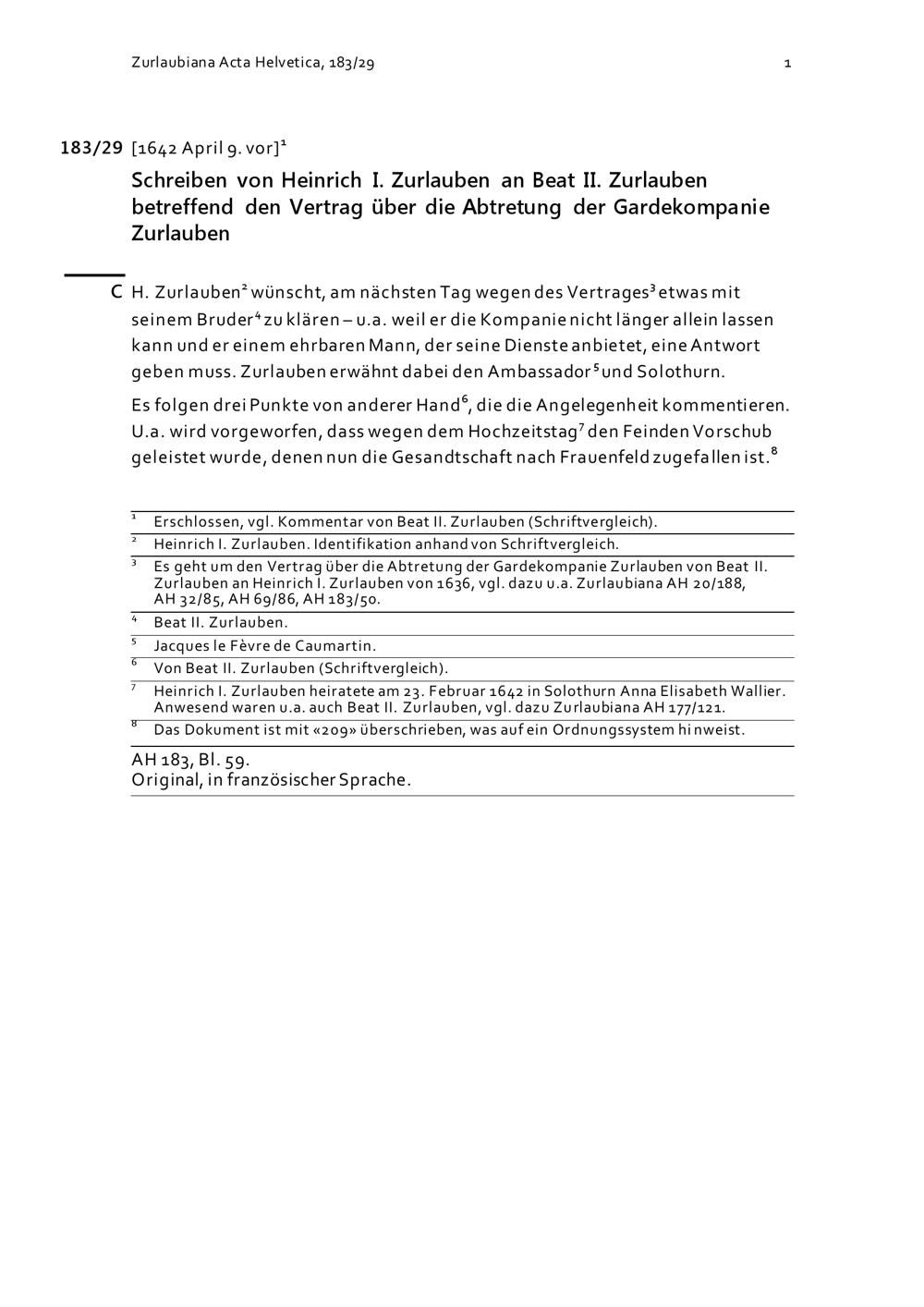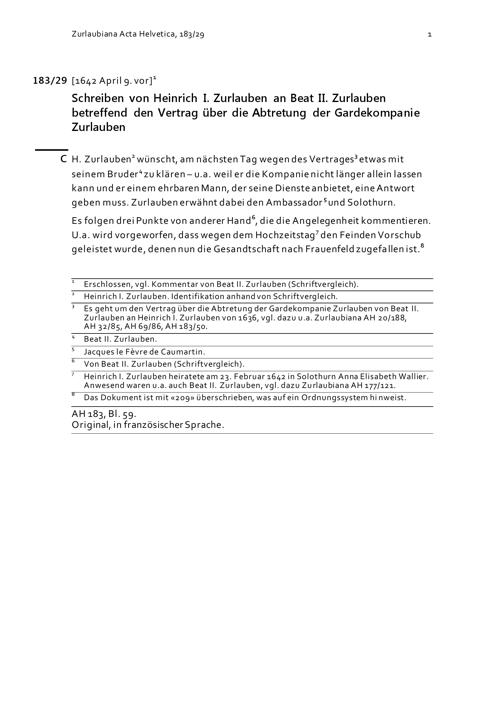 Schreiben von Heinrich I. Zurlauben an Beat II. Zurlauben betreffend den Vertrag über die Abtretung der Gardekompanie Zurlauben