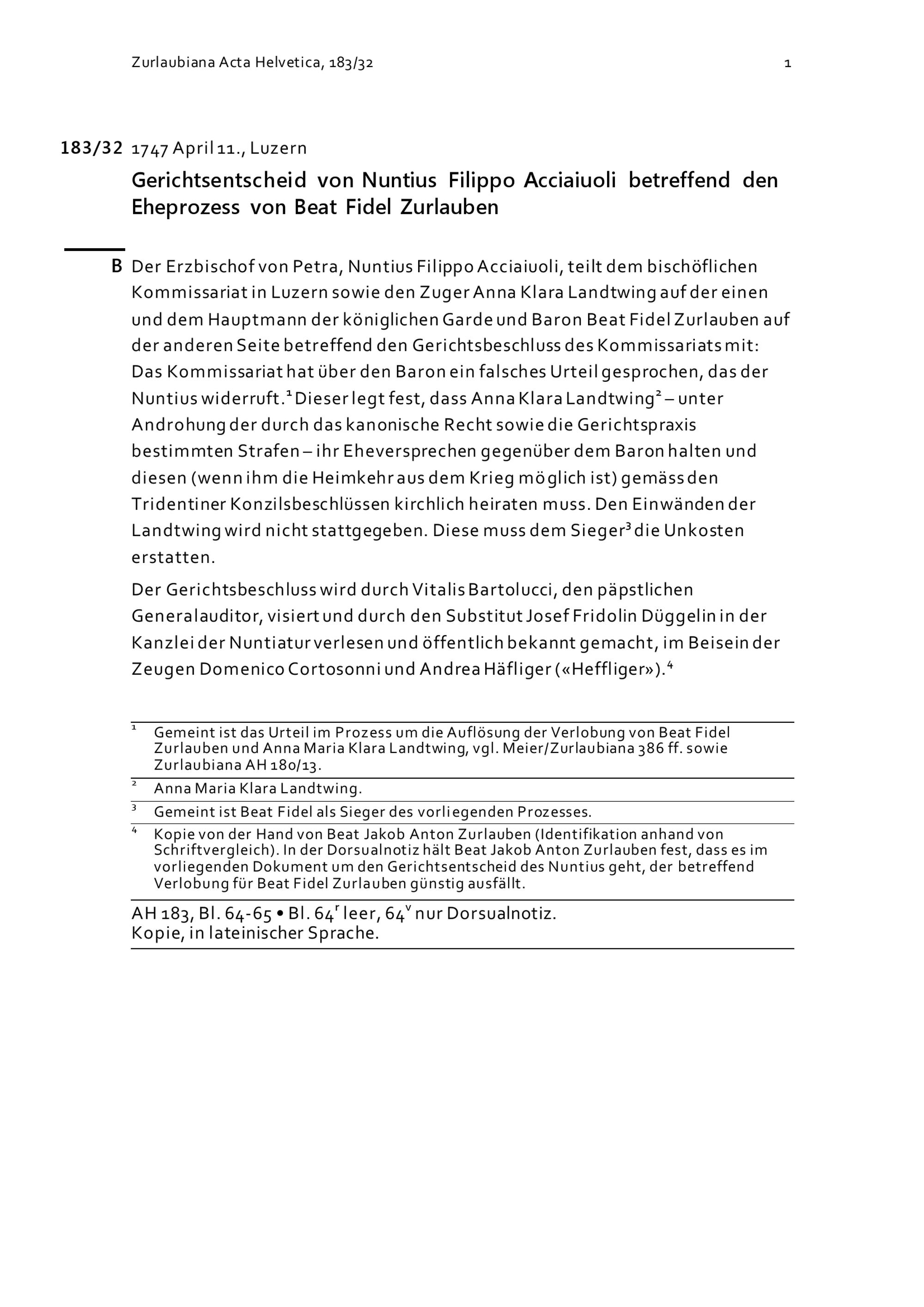 Gerichtsentscheid von Nuntius Filippo Acciaiuoli betreffend den Eheprozess von Beat Fidel Zurlauben