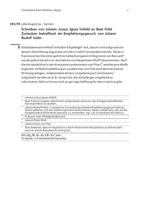 Schreiben von Johann Justus Ignaz Imfeld an Beat Fidel Zurlauben betreffend ein Empfehlungsgesuch von Johann Rudolf Iselin