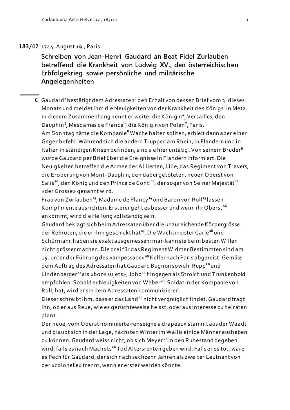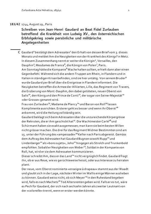 Schreiben von Jean-Henri Gaudard an Beat Fidel Zurlauben betreffend die Krankheit von Ludwig XV., den österreichischen Erbfolgekrieg sowie persönliche und militärische Angelegenheiten