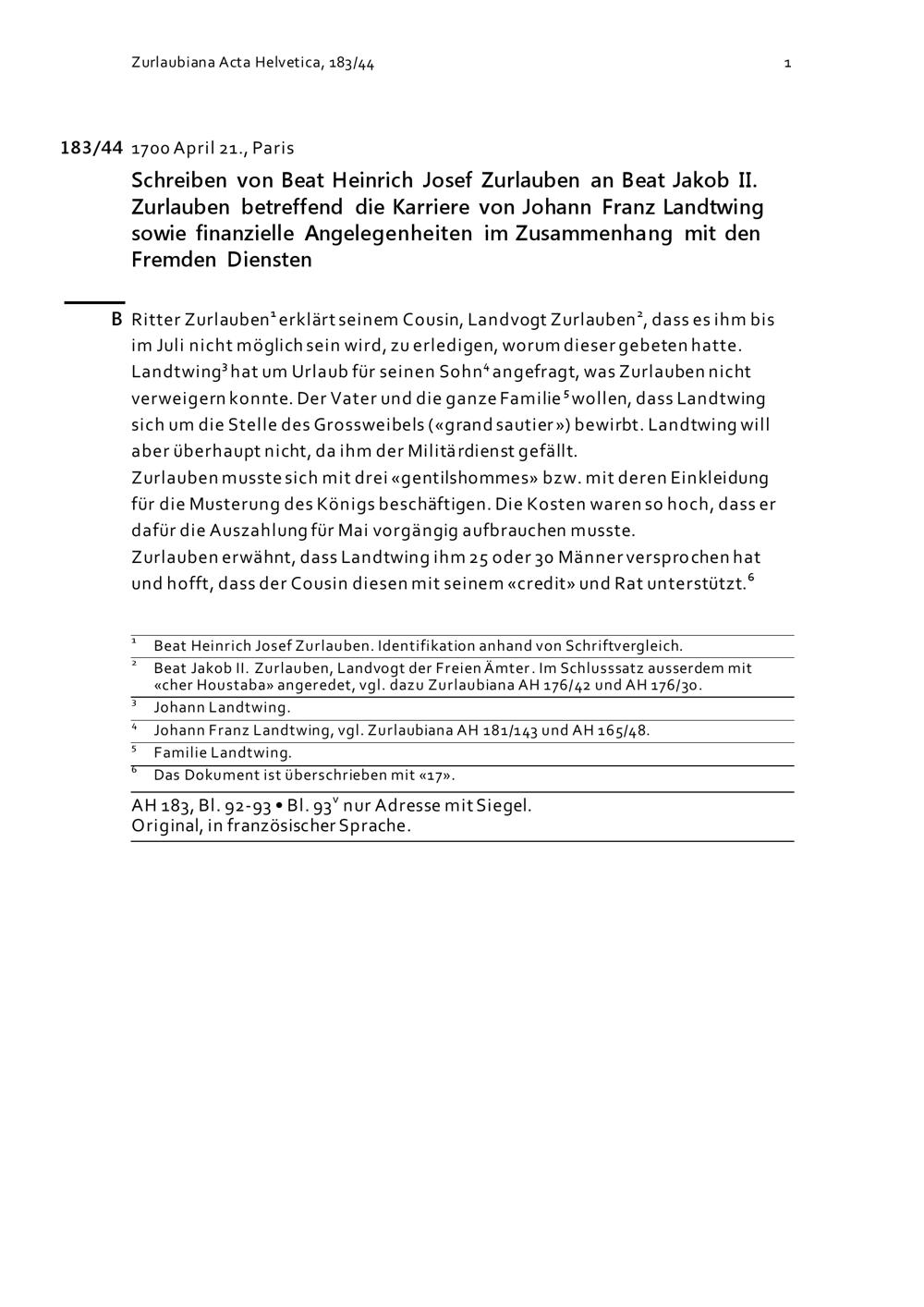 Schreiben von Beat Heinrich Josef Zurlauben an Beat Jakob II. Zurlauben betreffend die Karriere von Johann Franz Landtwing sowie finanzielle Angelegenheiten in Zusammenhang mit den Fremden Diensten