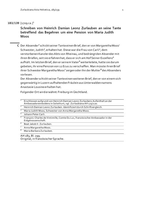 Schreiben von Heinrich Damian Leonz Zurlauben an seine Tante betreffend das Begehren um eine Pension von Maria Judith Moos