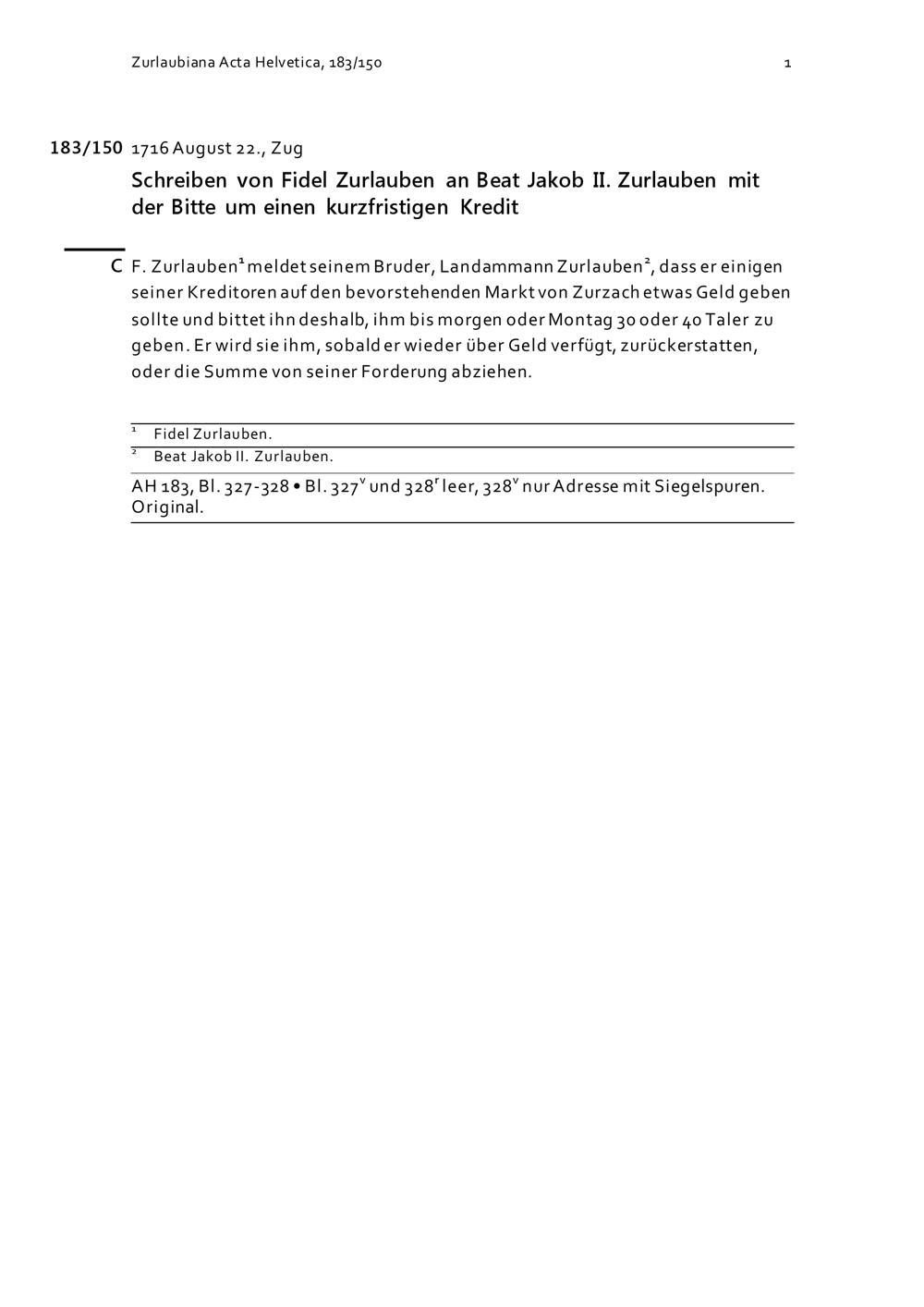 Schreiben von Fidel Zurlauben an Beat Jakob II. Zurlauben mit der Bitte um einen kurzfristigen Kredit