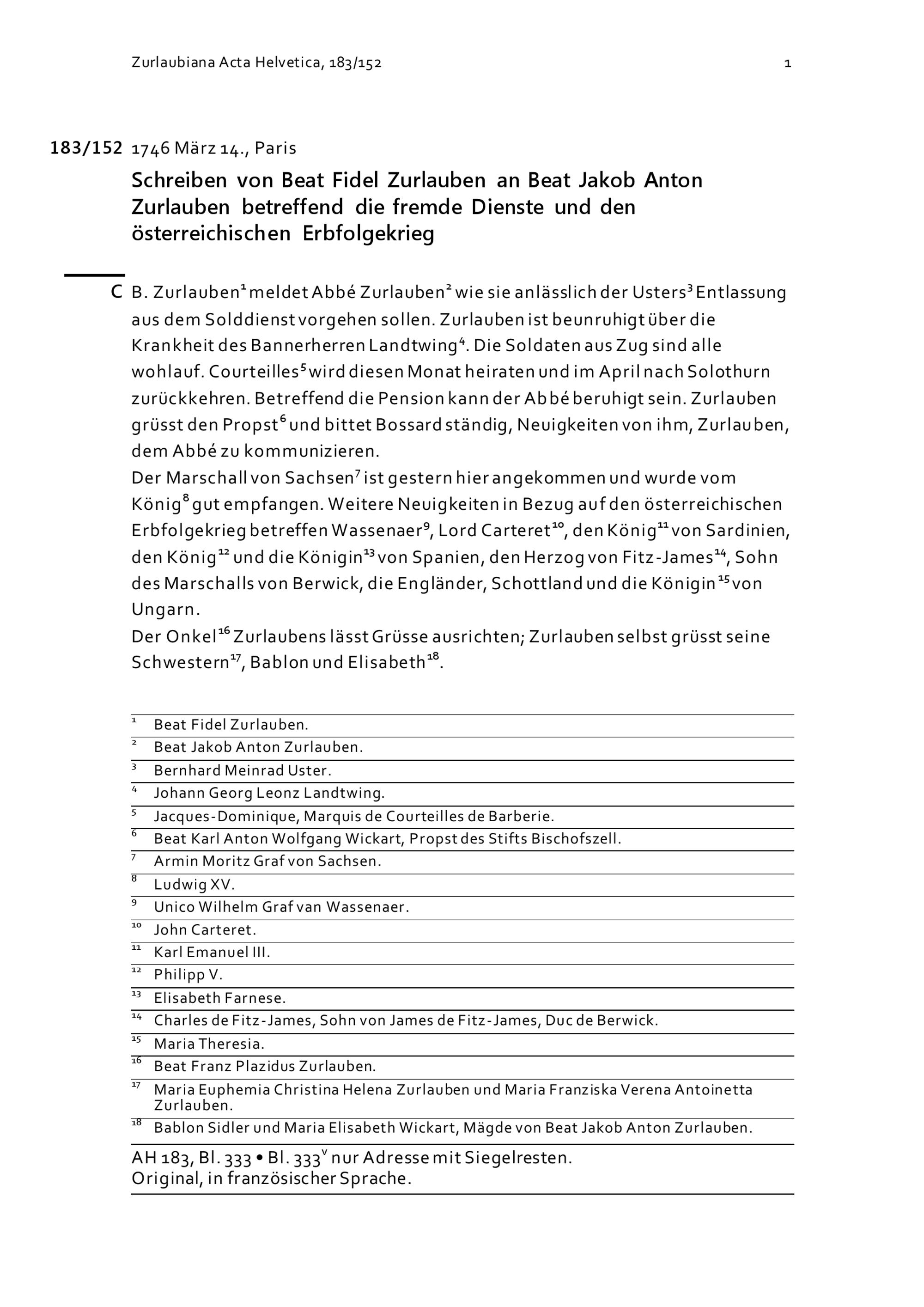 Schreiben von Beat Fidel Zurlauben an Beat Jakob Anton Zurlauben, seinen Onkel, Priester und Benefiziar, betreffend Nachrichten aus den Fremden Diensten in Frankreich von Personen aus Zug