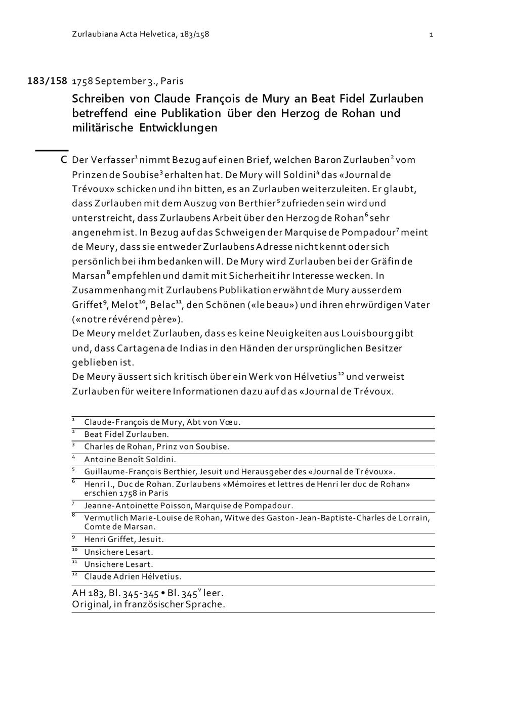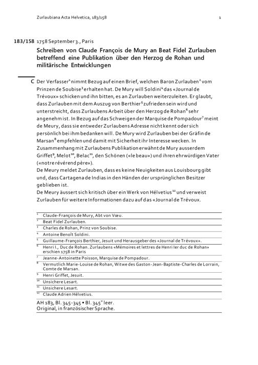 Schreiben von Claude-François de Mury an Beat Fidel Zurlauben betreffend eine Publikation...