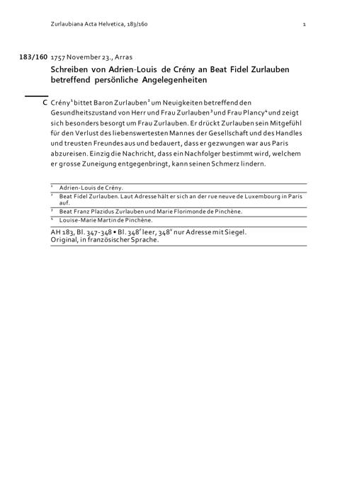 Schreiben von Adrien-Louis de Crény an Beat Fidel Zurlauben betreffend persönliche Angelegenheiten