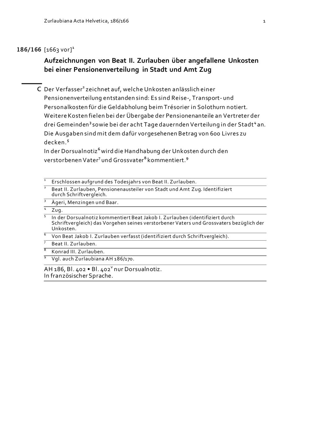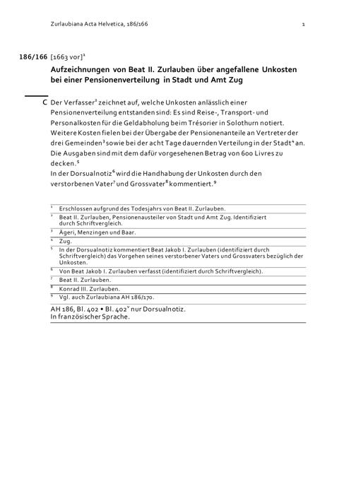 Aufzeichnungen von Beat II. Zurlauben über angefallene Unkosten bei einer Pensionenverteilung in Stadt und Amt Zug