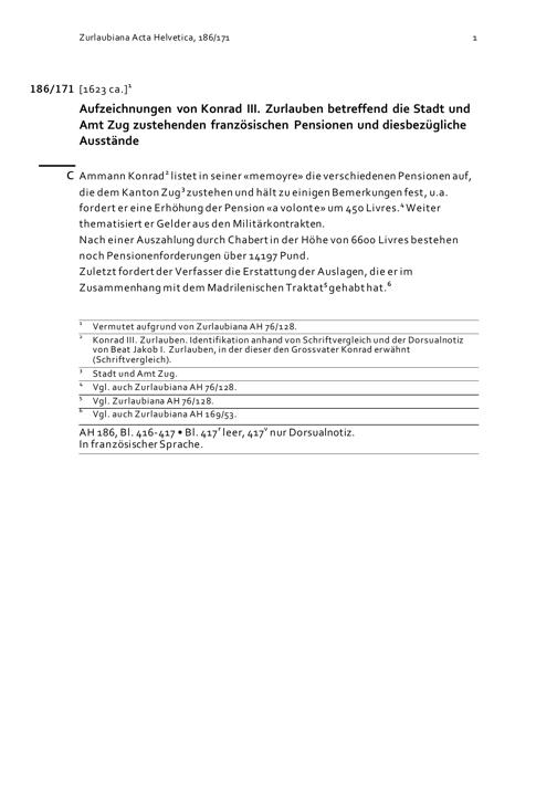 Aufzeichnungen von Konrad III. Zurlauben betreffend die Stadt und Amt Zug zustehenden französischen Pensionen und diesbezügliche Ausstände